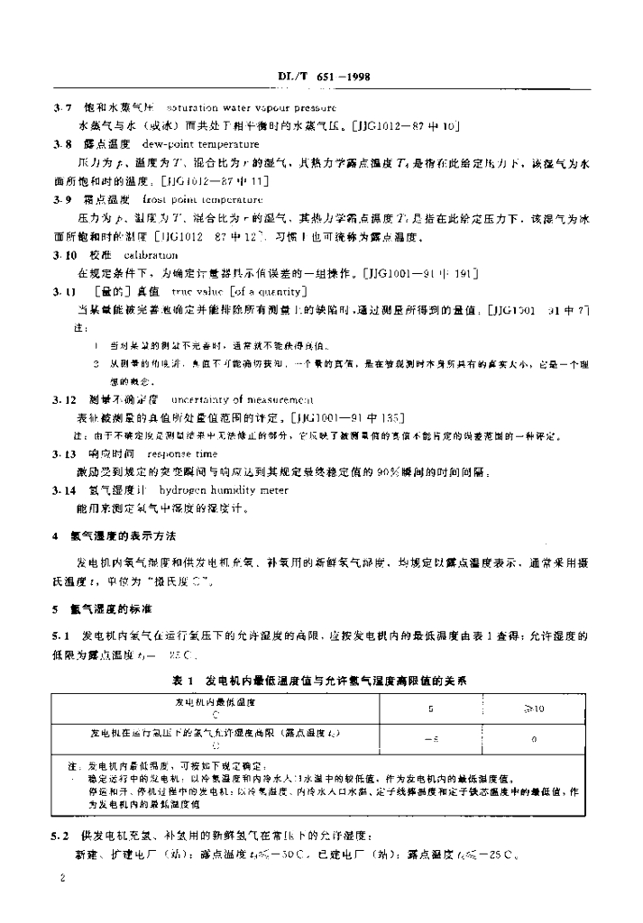 DL/T 651-1998 氢冷发电机氢气湿度的技术要求