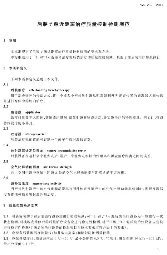 WS 262-2017 后装γ源近距离治疗质量控制检测规范