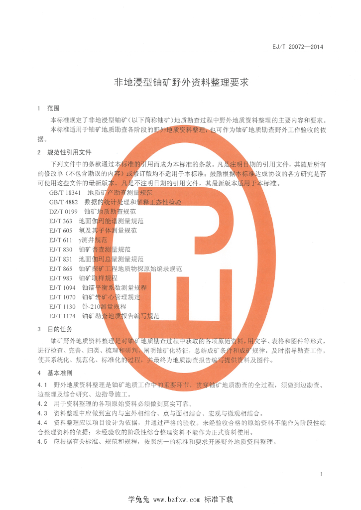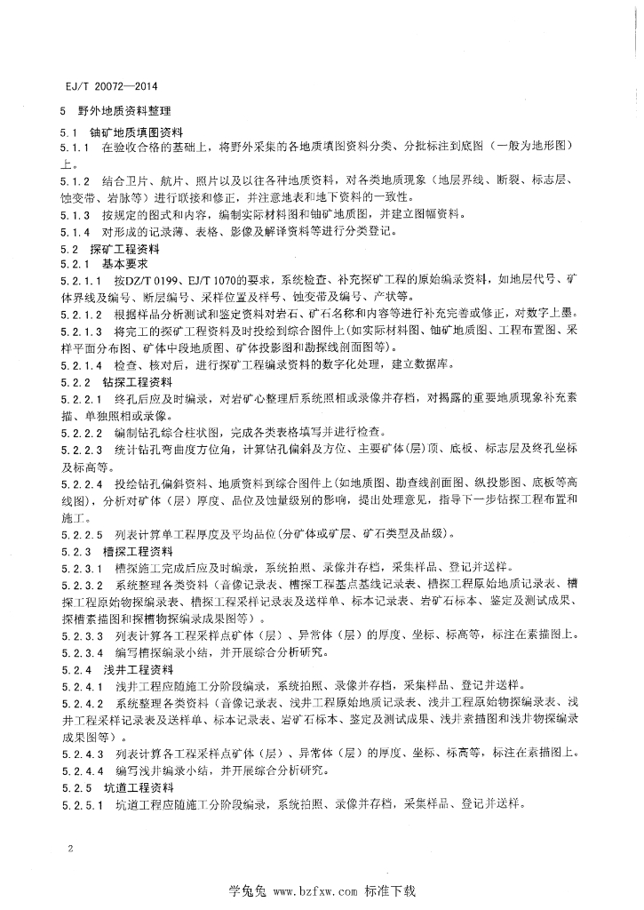 EJ/T 20072-2014 非地浸型铀矿野外资料整理要求