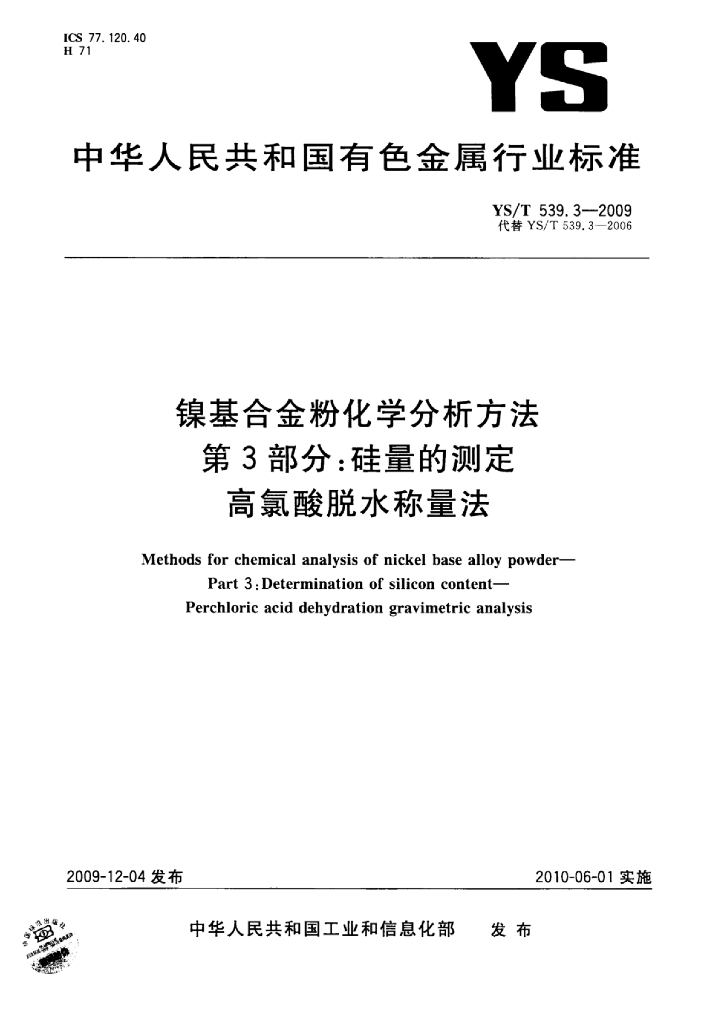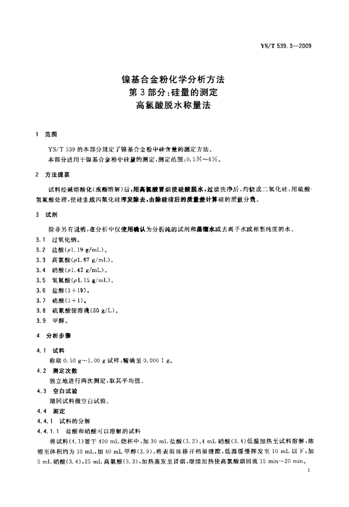 YS/T 539.3-2009 镍基合金粉化学分析方法 第3部分:硅量的测定高氯酸脱水称量法