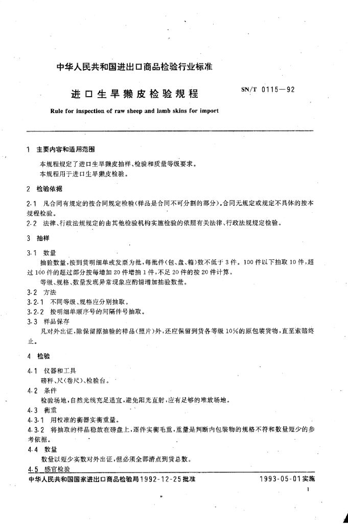 SN/T 0115-1992 进口生旱獭皮检验规程