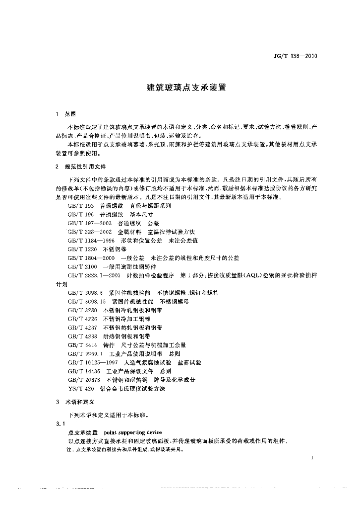 JG/T 138-2010 建筑玻璃点支承装置
