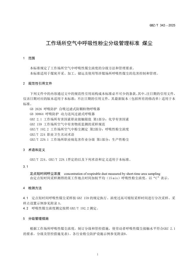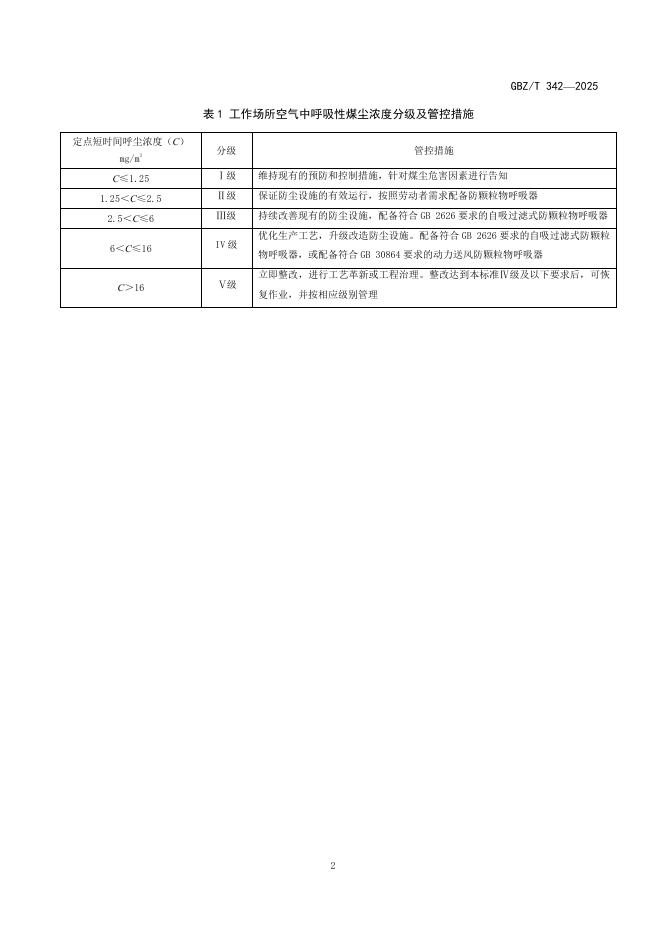 GBZ/T 342-2025 工作场所空气中呼吸性粉尘分级管理标准 煤尘