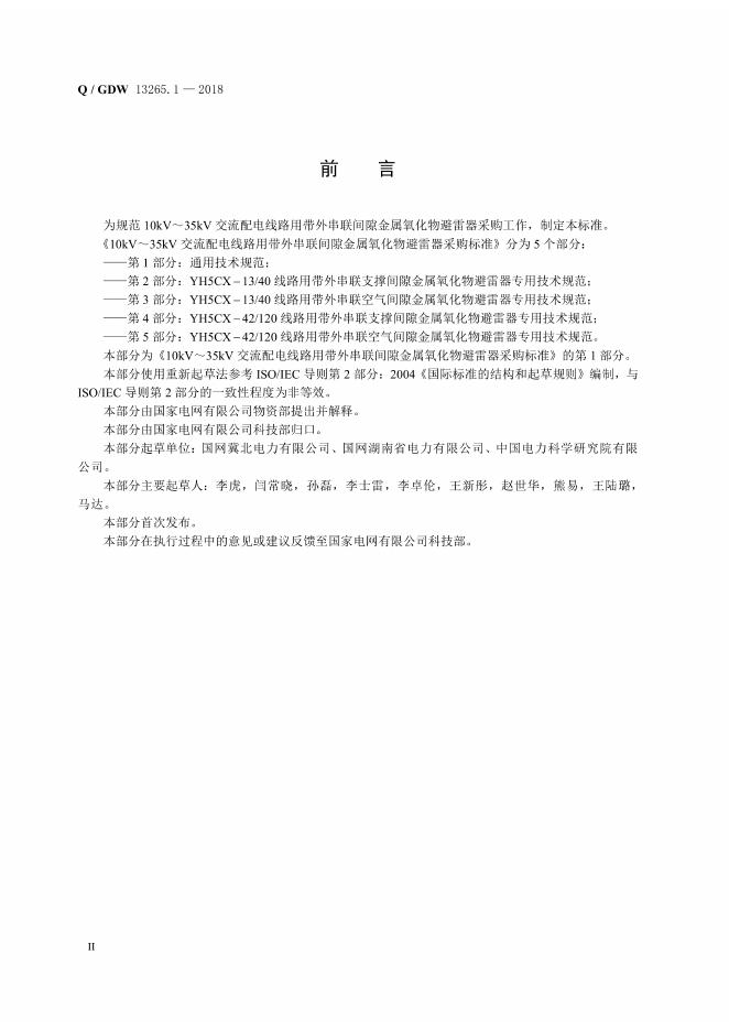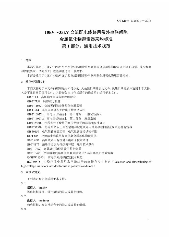 Q/GDW 13265.1-2018 10kV~35kV交流配电线路用带外串联间隙金属氧化物避雷器采购标准 第1部分:通用技术规范