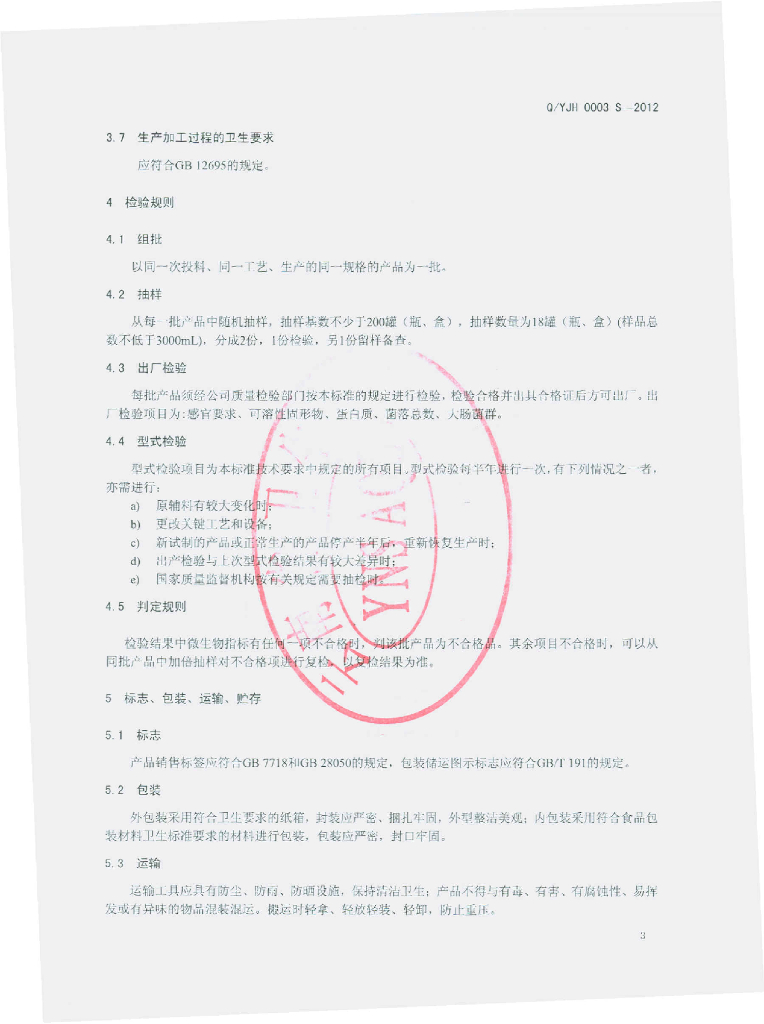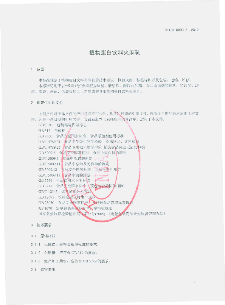 Q/YJH 0003S-2012 植物蛋白饮料 火麻乳