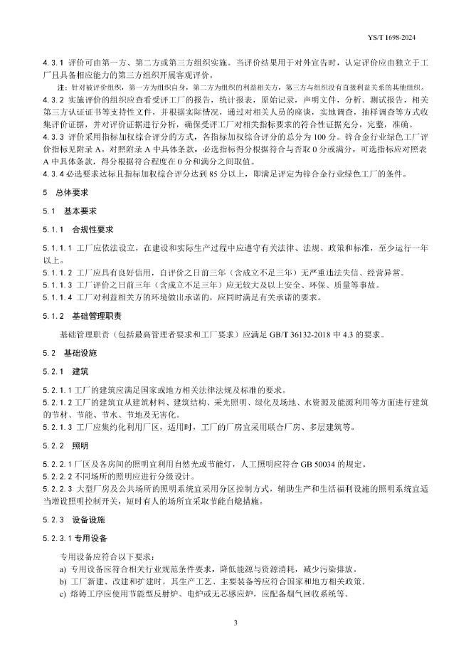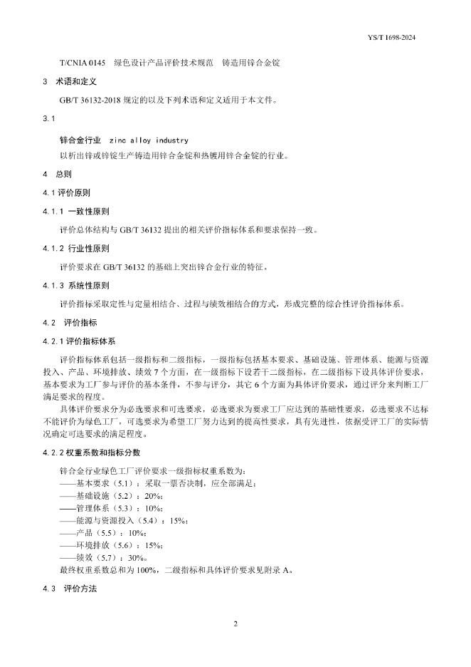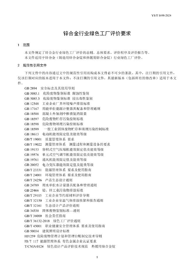 YS/T 1698-2024 锌合金行业绿色工厂评价要求