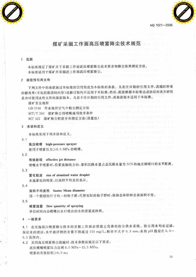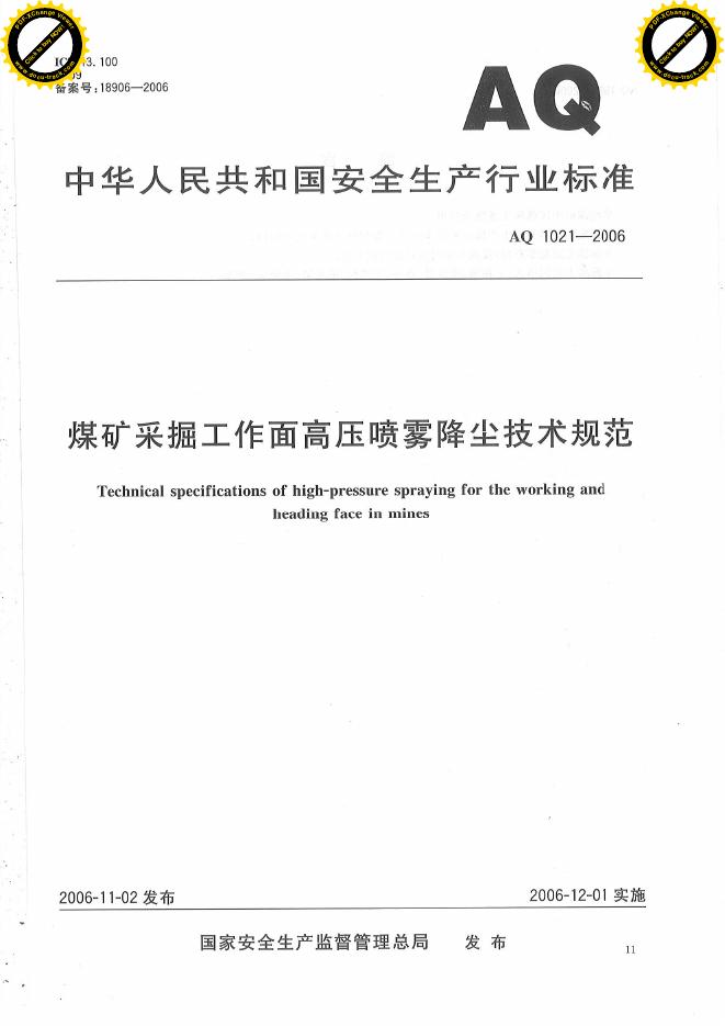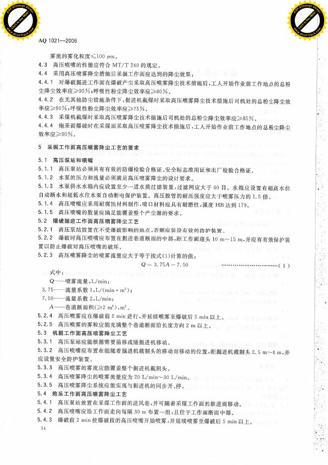 AQ/T 1021-2006 煤矿采掘工作面高压喷雾降尘技术规范