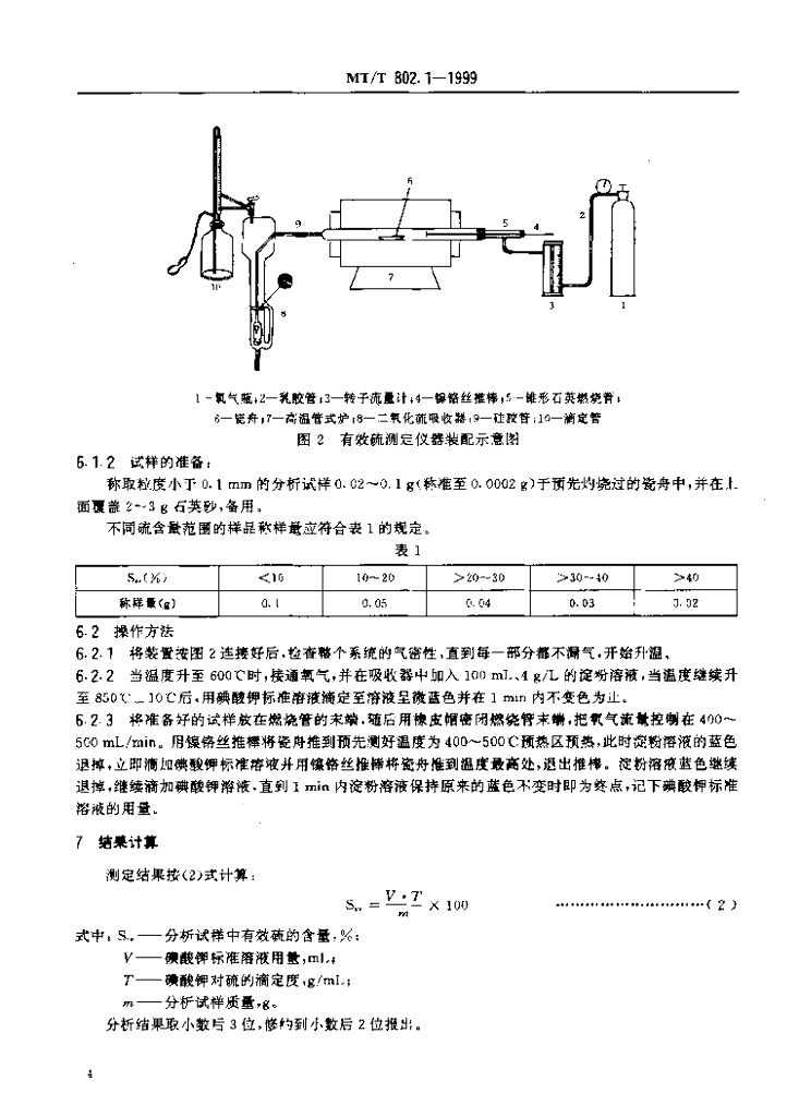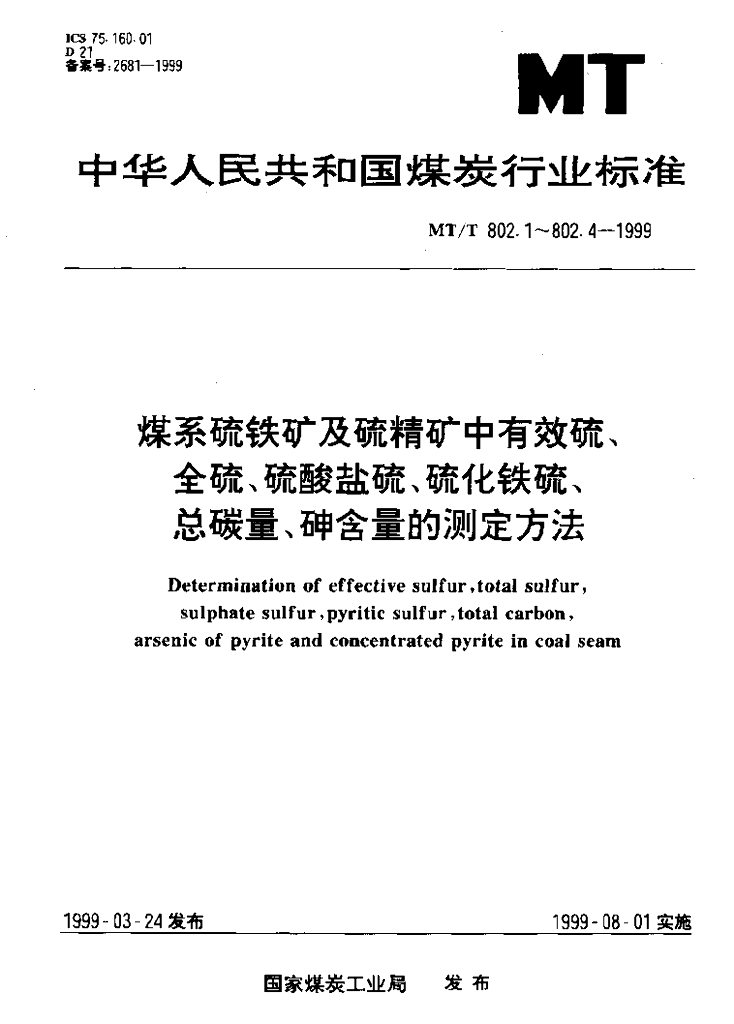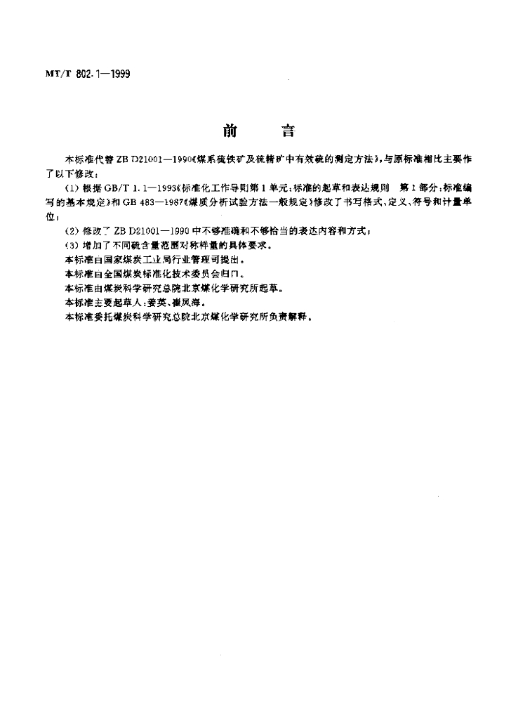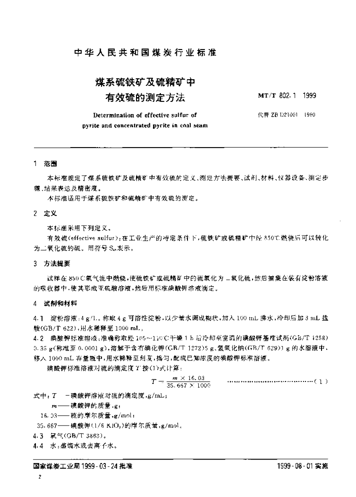 MT/T 802.1-1999 煤系硫铁矿及硫精矿中有效硫的测定方法