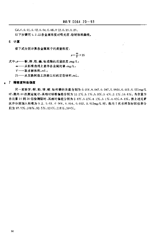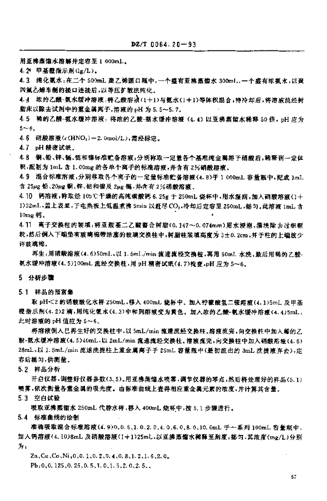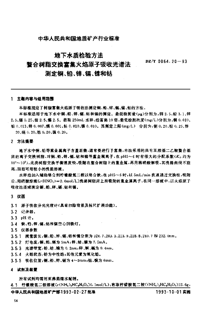 DZ/T 0064.20-1993 地下水质检验方法 螯合树脂交换富集火焰原子吸收光谱法测定铜、铅、锌、镉、镍和钴