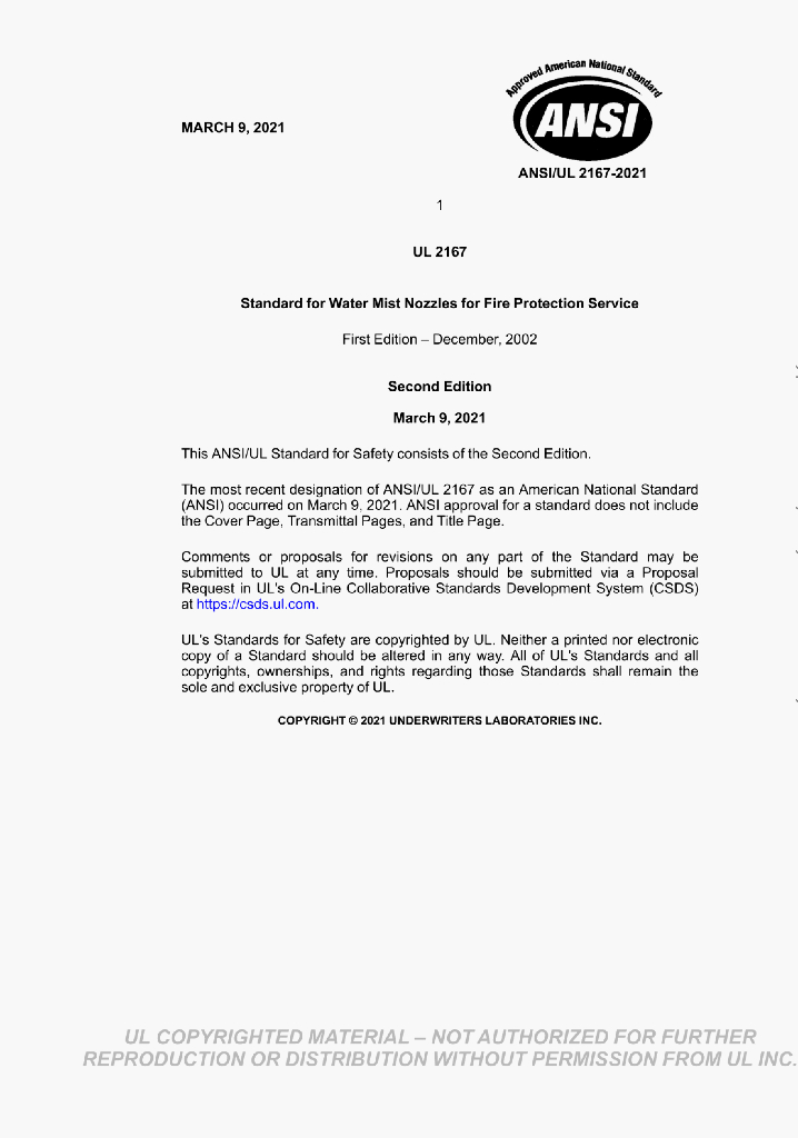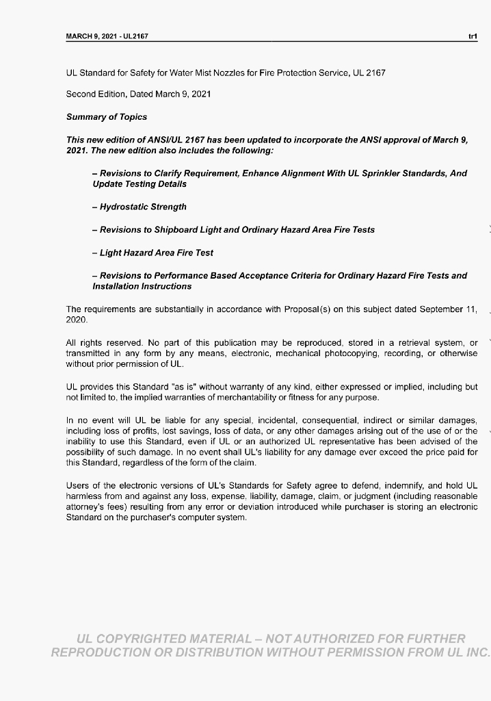 UL 2167 STANDARD FOR SAFETY Water Mist Nozzles for Fire ProtectionService
