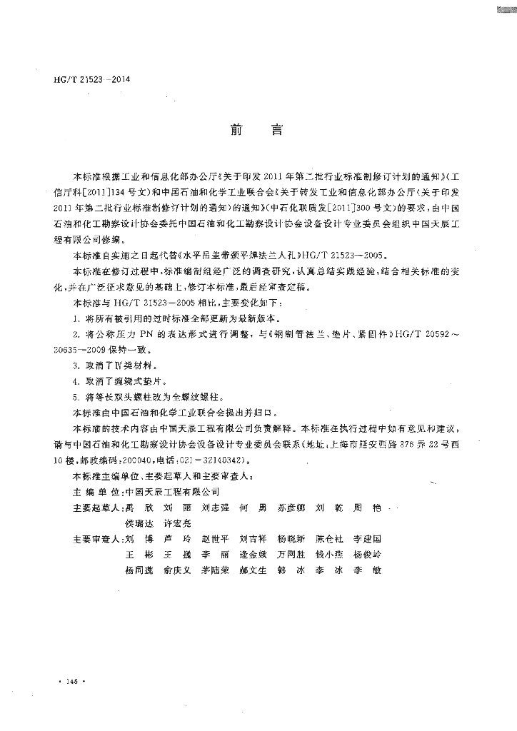 HG/T 21523-2014 代替 HG/T 21523-2005 水平吊盖带颈平焊法兰人孔