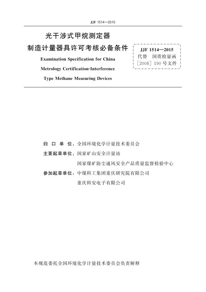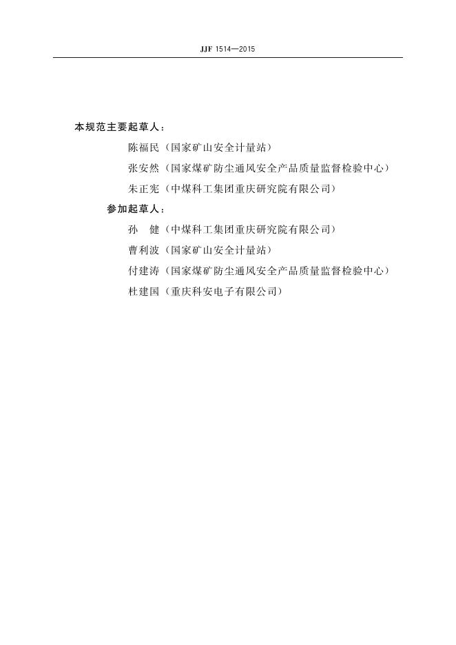 陈福民(国家矿山安全计量站)、张安然(国家煤矿防尘通风安全产品质量监督检验中心)、朱正宪(中煤科工集团重庆研究院有限公司)、孙健(中煤科工集团重庆研究院有限公司) 、曹利波(国家矿山安全计量站)、付建涛(国家煤矿防尘通风安全产品质量监督检验中心)、杜建国(重庆科安电子有限公司)