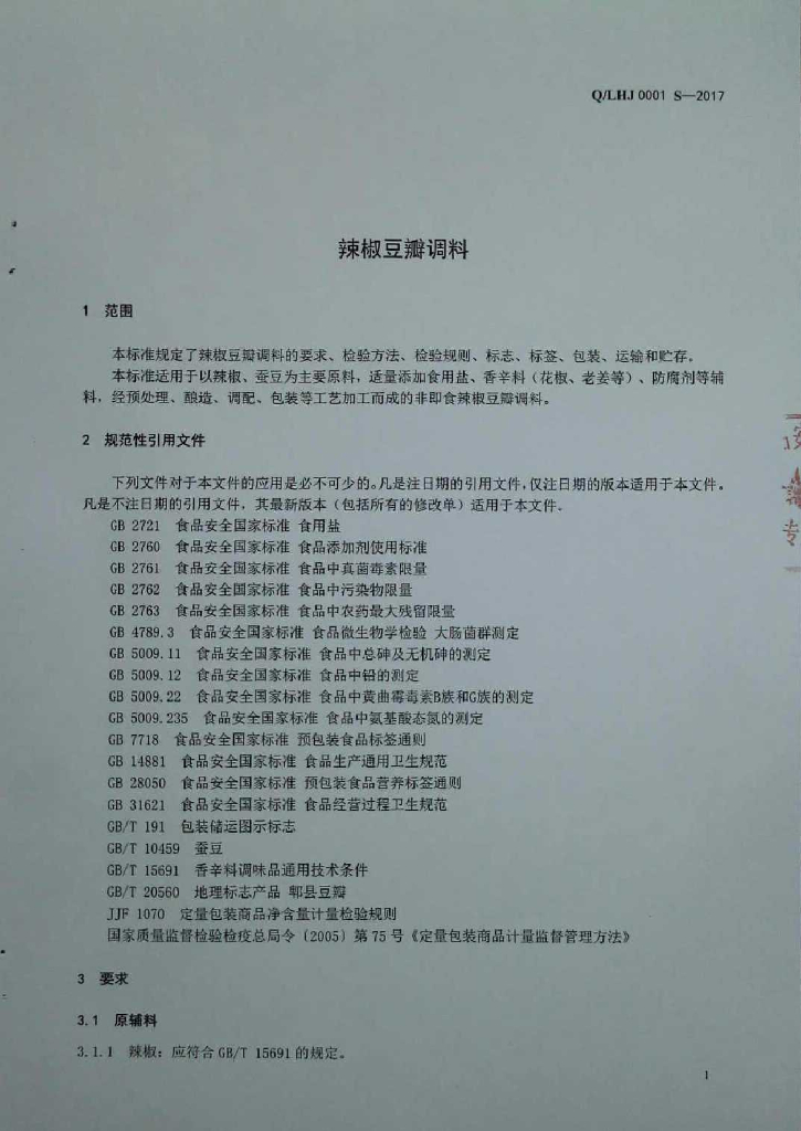 Q/LHJ 0001S-2017 辣椒豆瓣调料
