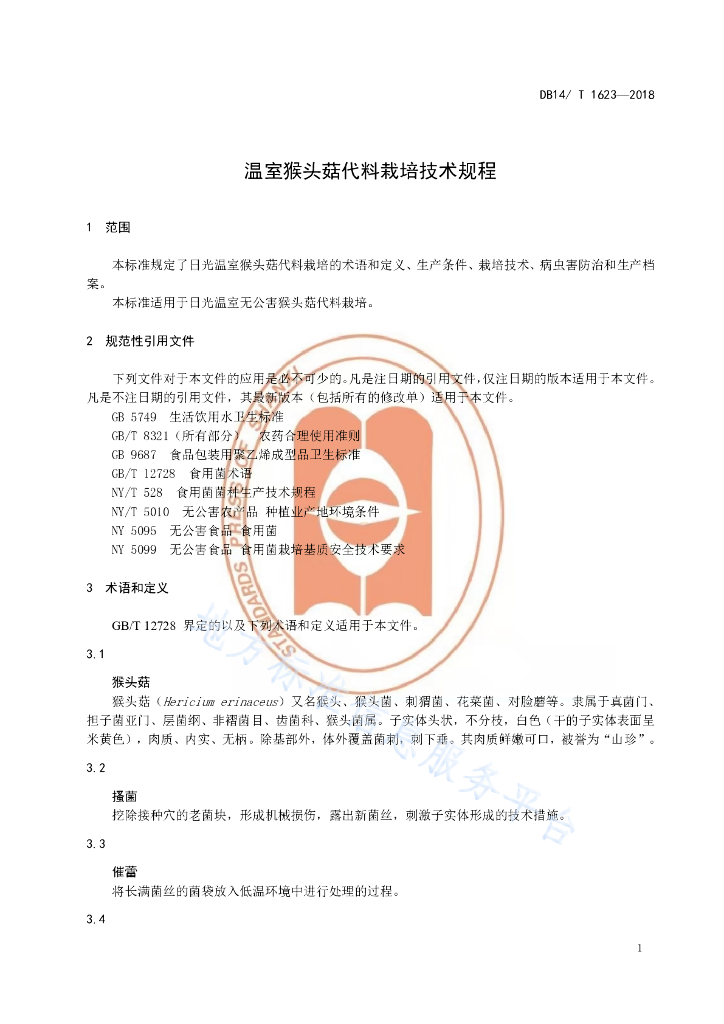 DB14/T 1623-2018 温室猴头菇代料栽培技术规程