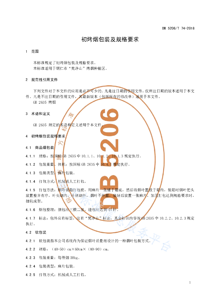 DB5206/T 74-2018 初烤烟包装及规格要求