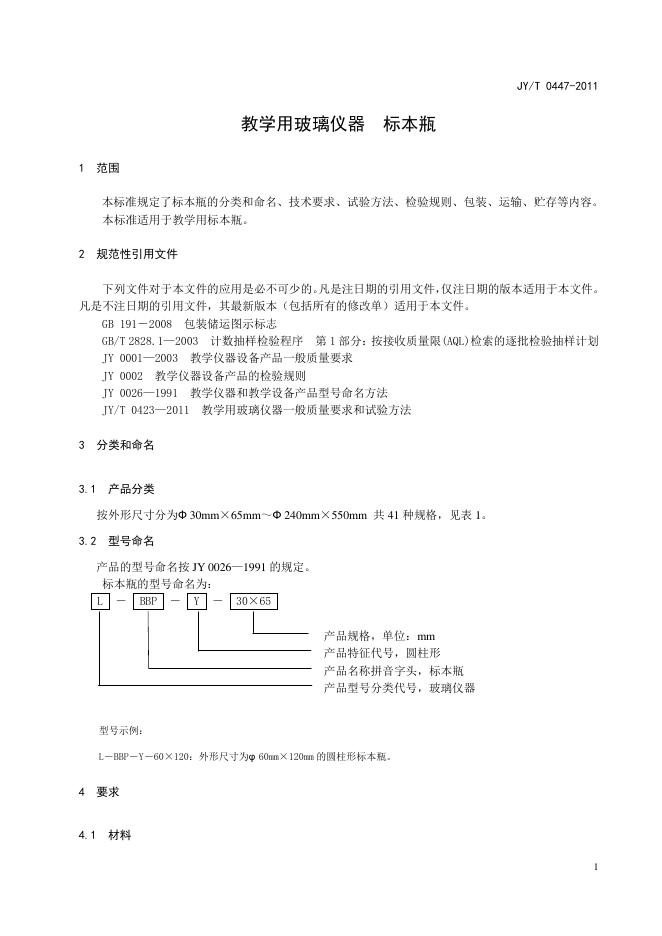 JY/T 0447-2011 教学用玻璃仪器 标本瓶