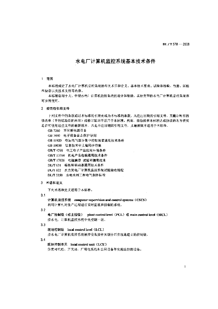 DL/T 578-2008 水电厂计算机监控系统基本技术条件