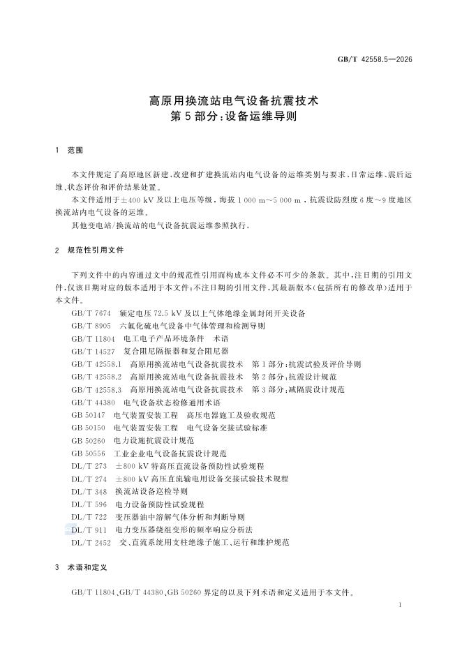 GB/T 42558.5-2026 高原用换流站电气设备抗震技术 第5部分:设备运维导则
