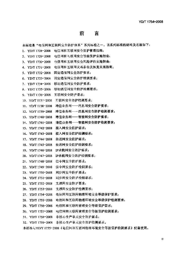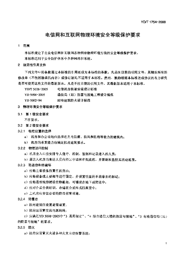 YD/T 1754-2008 电信网和互联网物理环境安全等级保护要求