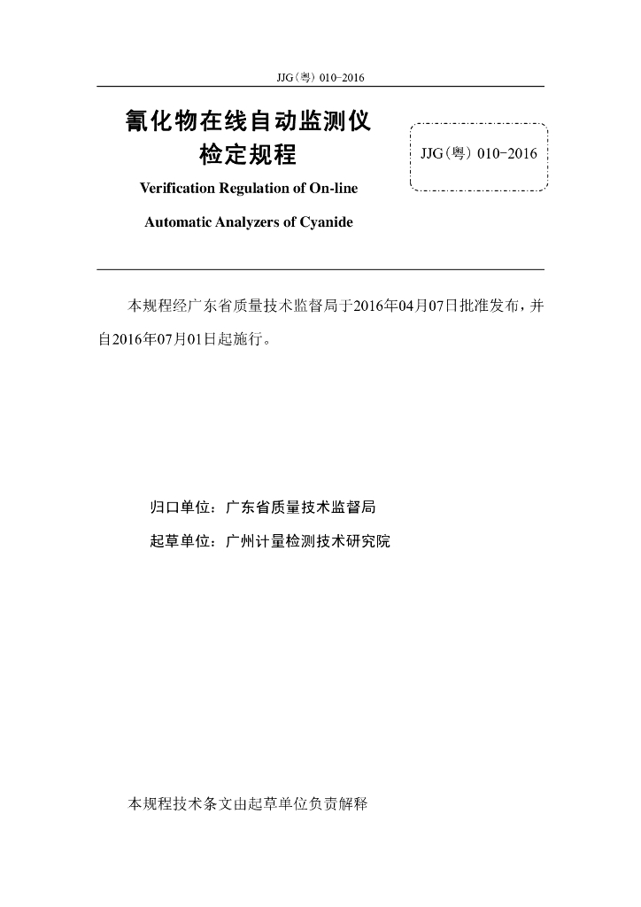JJG(粤) 010-2016 氰化物在线自动监测仪