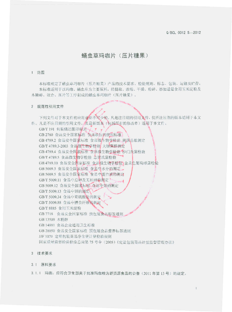 Q/BCL 0012S-2012 蛹虫草玛咖片(压片糖果)