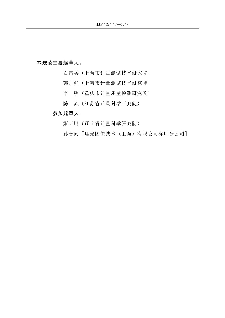 石雷兵(上海市计量测试技术研究院)、韩志强(上海市计量测试技术研究院)、李明(重庆市计量质量检测研究院)、陈焱(江苏省计量科学研究院)、姬云鹏(辽宁省计量科学研究院)、孙春雨(理光图像技术(上海)有限公司深圳分公司)