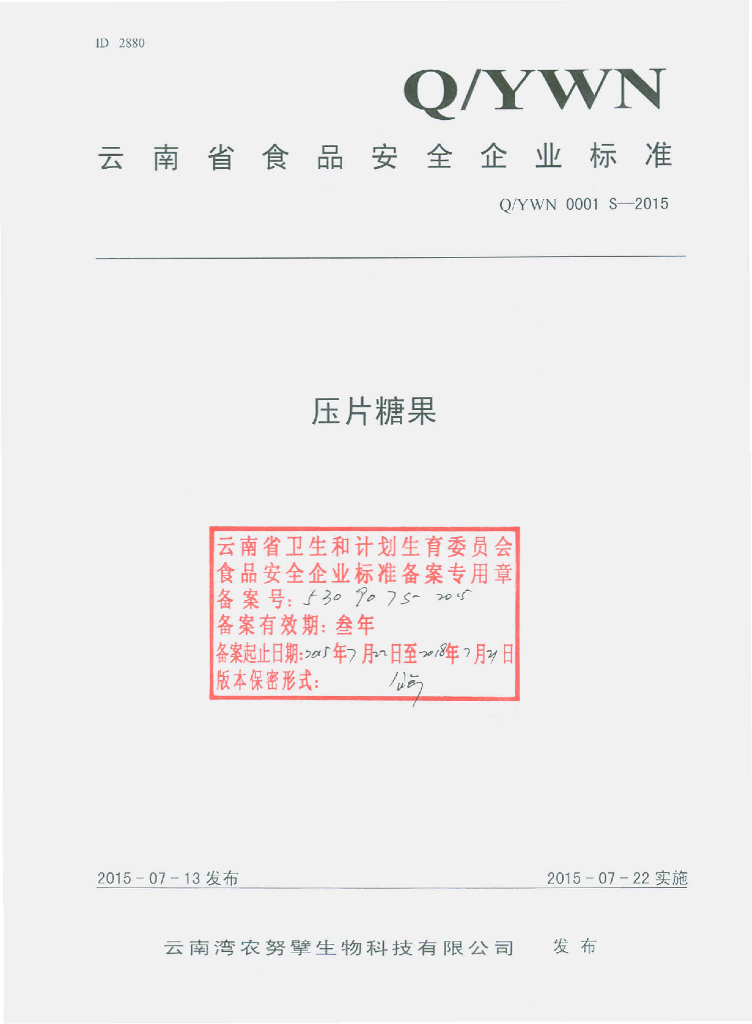 Q/YWN 0001S-2015 云南湾农努擘生物科技有限公司 压片糖果