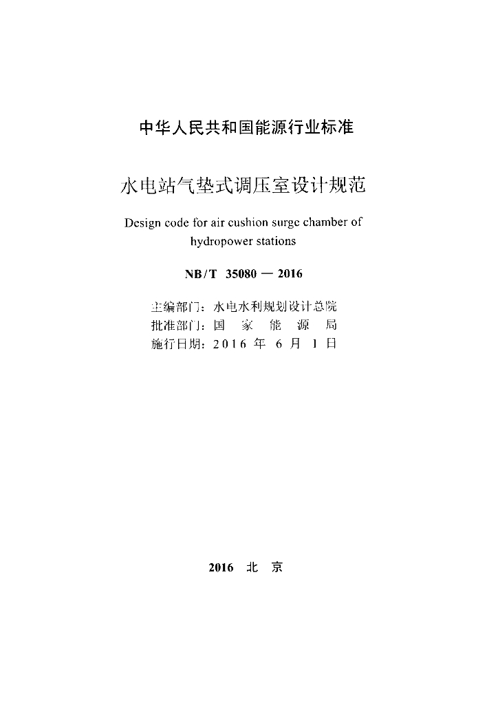 NB/T 35080-2016 水电站气垫式调压室设计规范