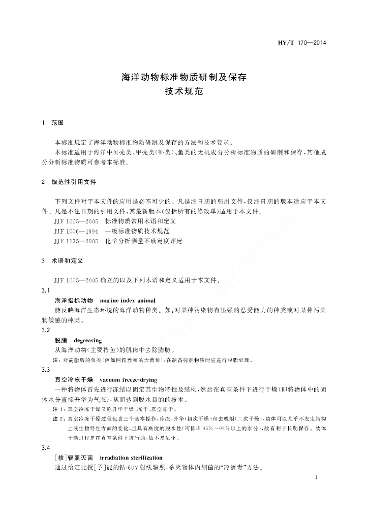 HY/T 170-2014 海洋动物标准物质研制及保存技术规范
