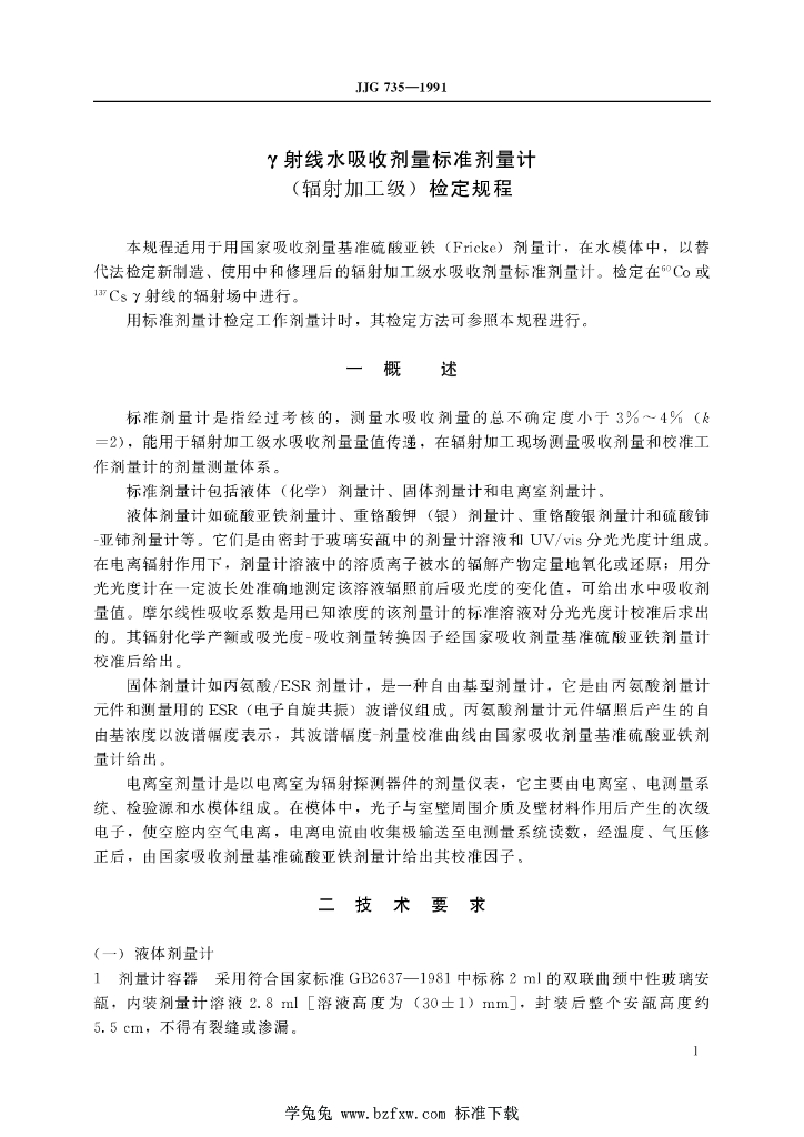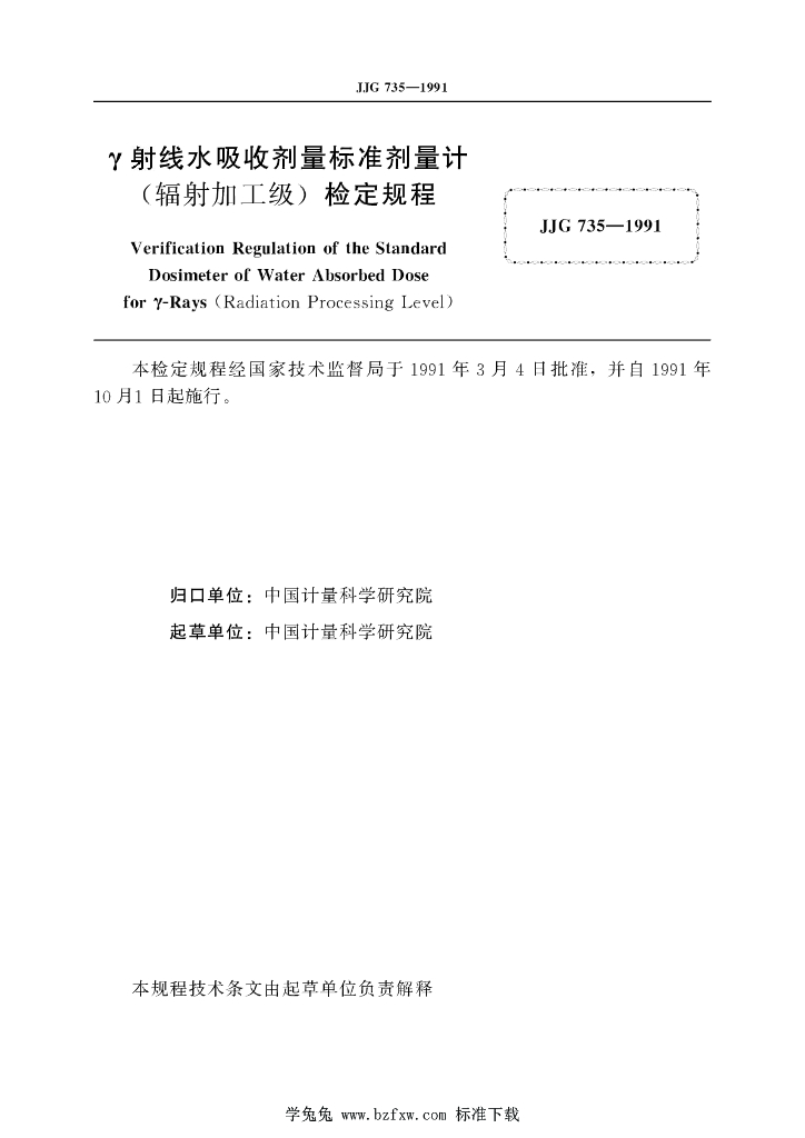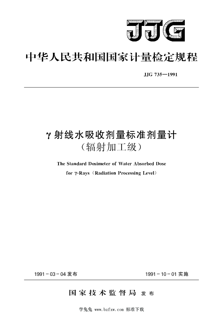JJG 735-1991 γ射线水吸收剂量标准剂量计(辐射加工级)