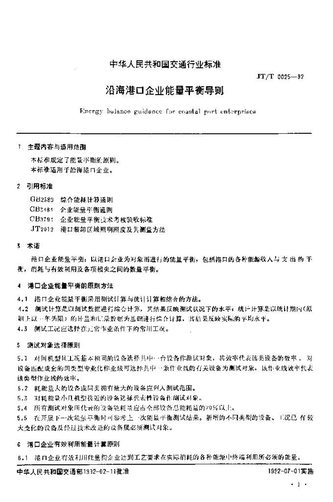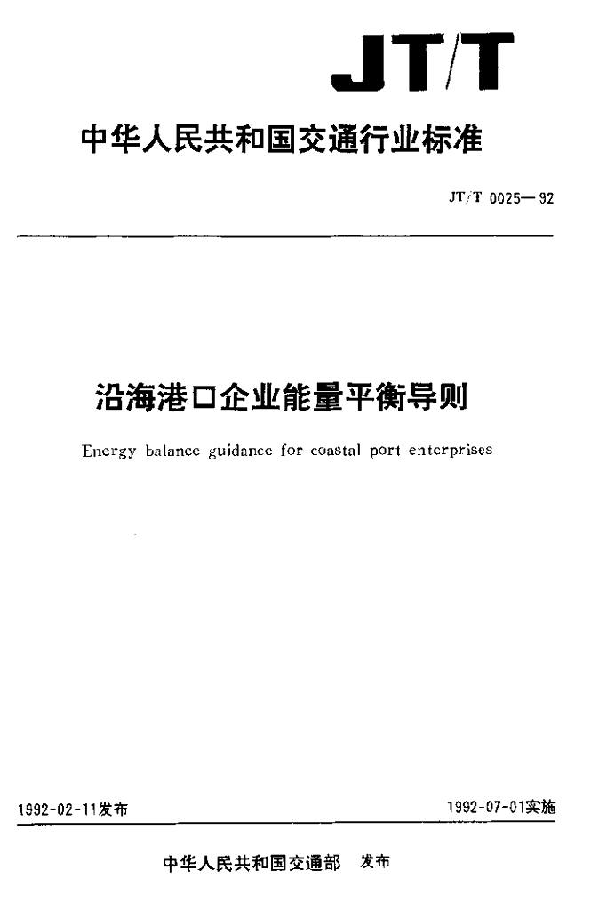 JT/T 0025-1992 沿海港口企业能量平衡导则