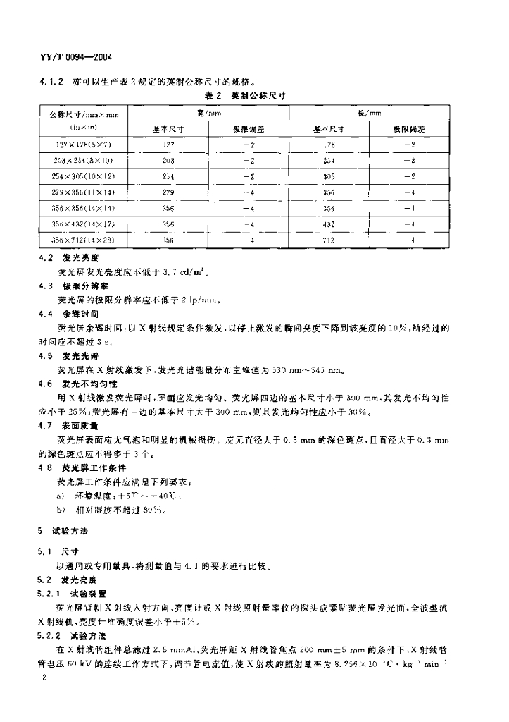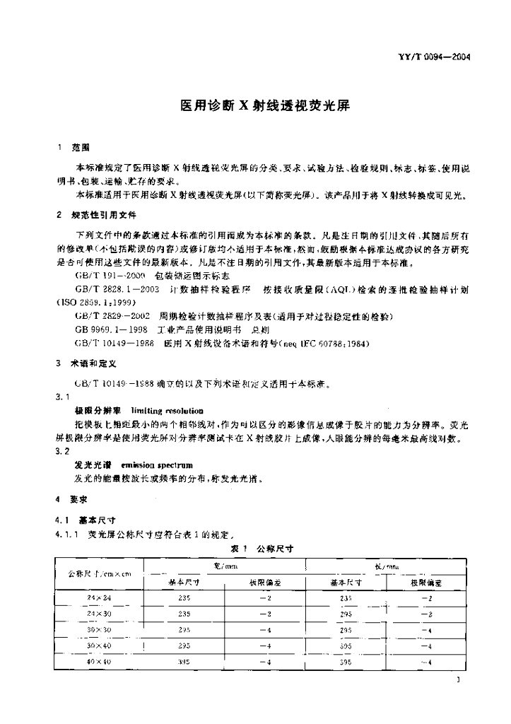 YY/T 0094-2004 医用诊断X射线透视荧光屏