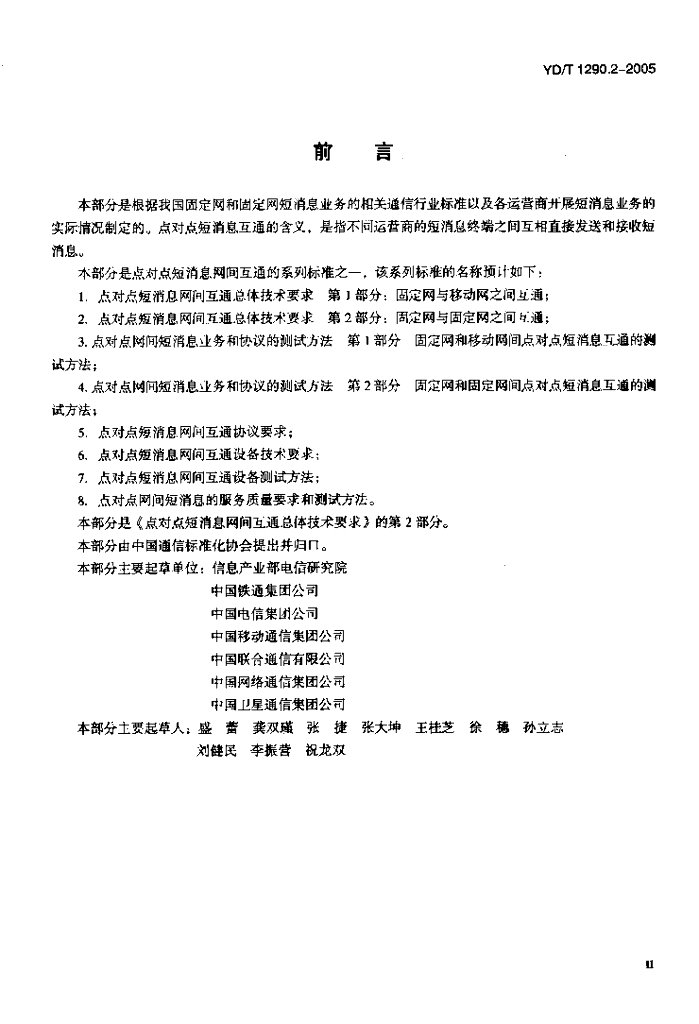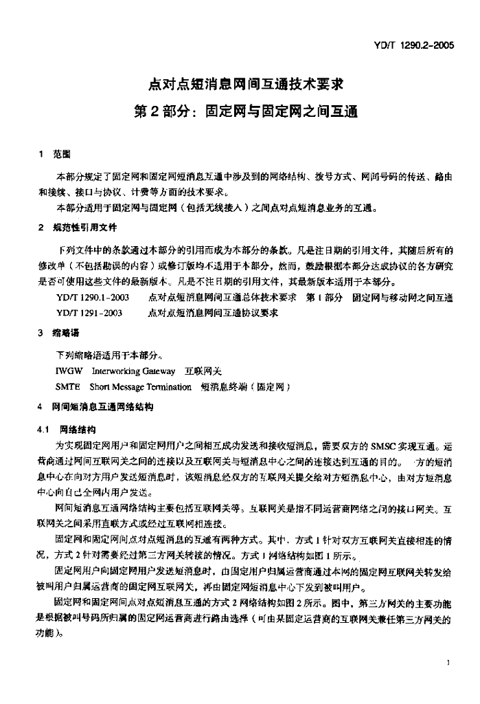 YD/T 1290.2-2005 点对点短消息网间互通总体技术要求 第2部分:固定网与固定网之间互通
