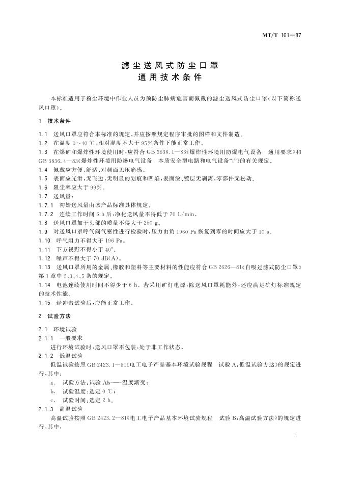 MT/T 161-1987 滤尘送风式防尘式口罩 通用技术条件