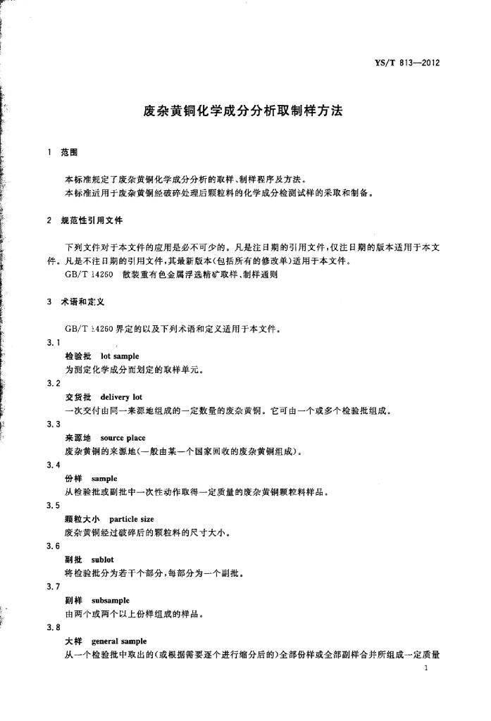 YS/T 813-2012 废杂黄铜化学成分分析取制样方法