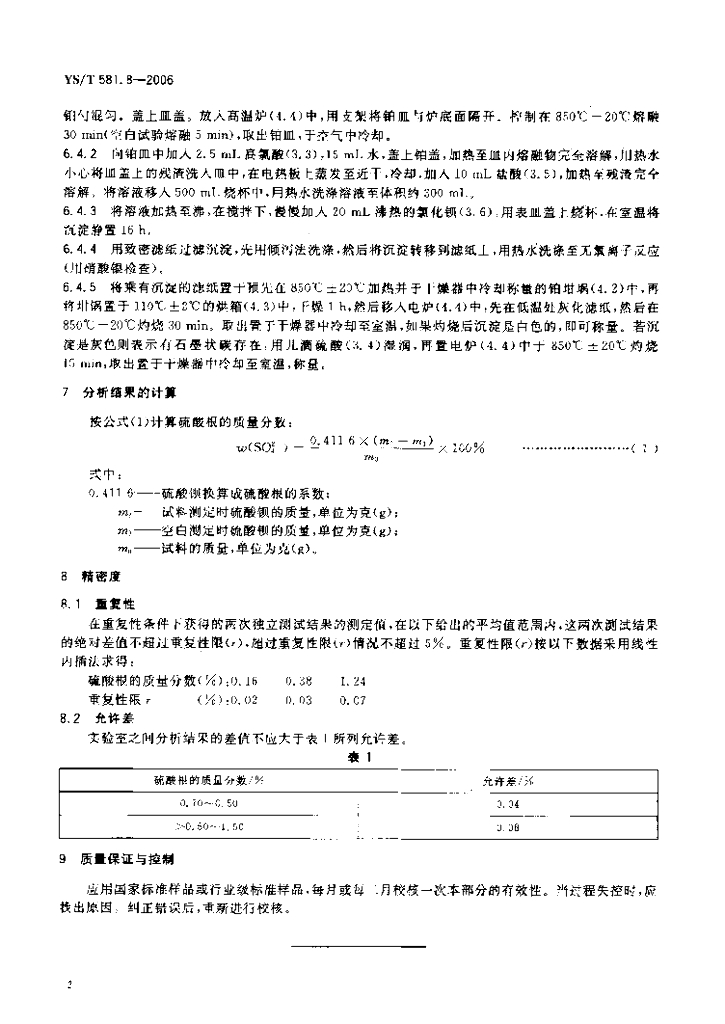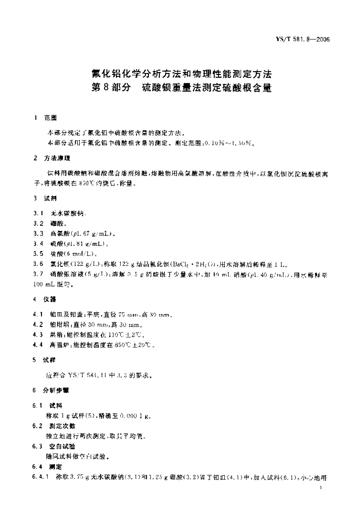YS/T 581.8-2006 氟化铝化学分析方法和物理性能测定方法 第8部分:硫酸钡重量法测定硫酸根含量