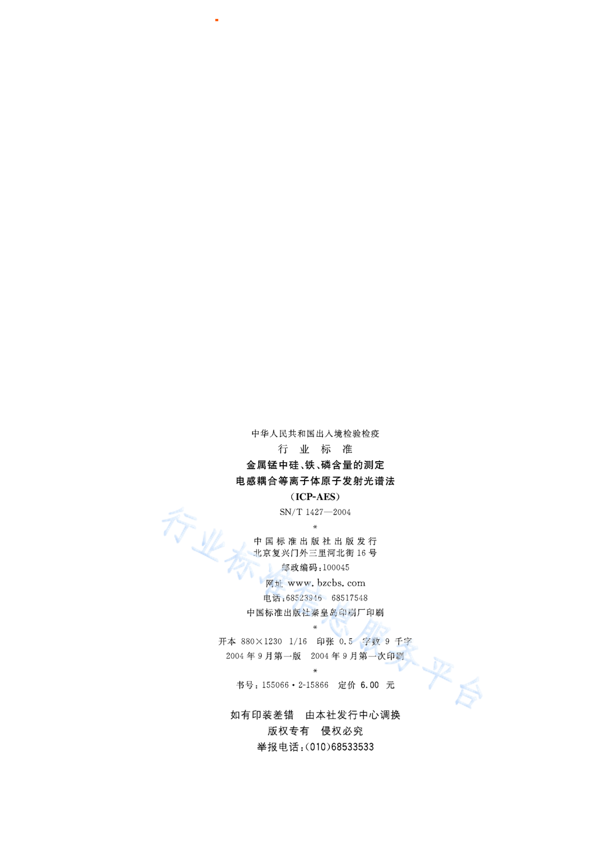 SN/T 1427-2004 金属锰中硅、铁、磷含量的测定 电感耦合等离子体原子发射光谱法