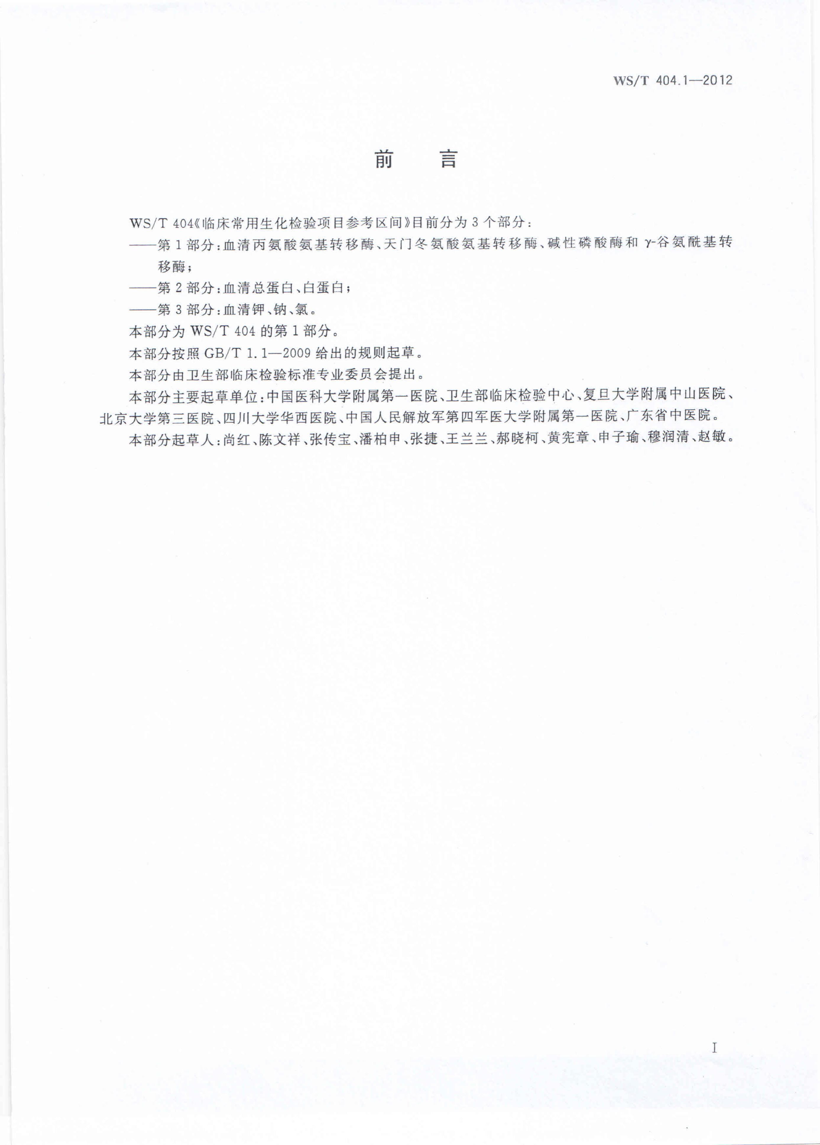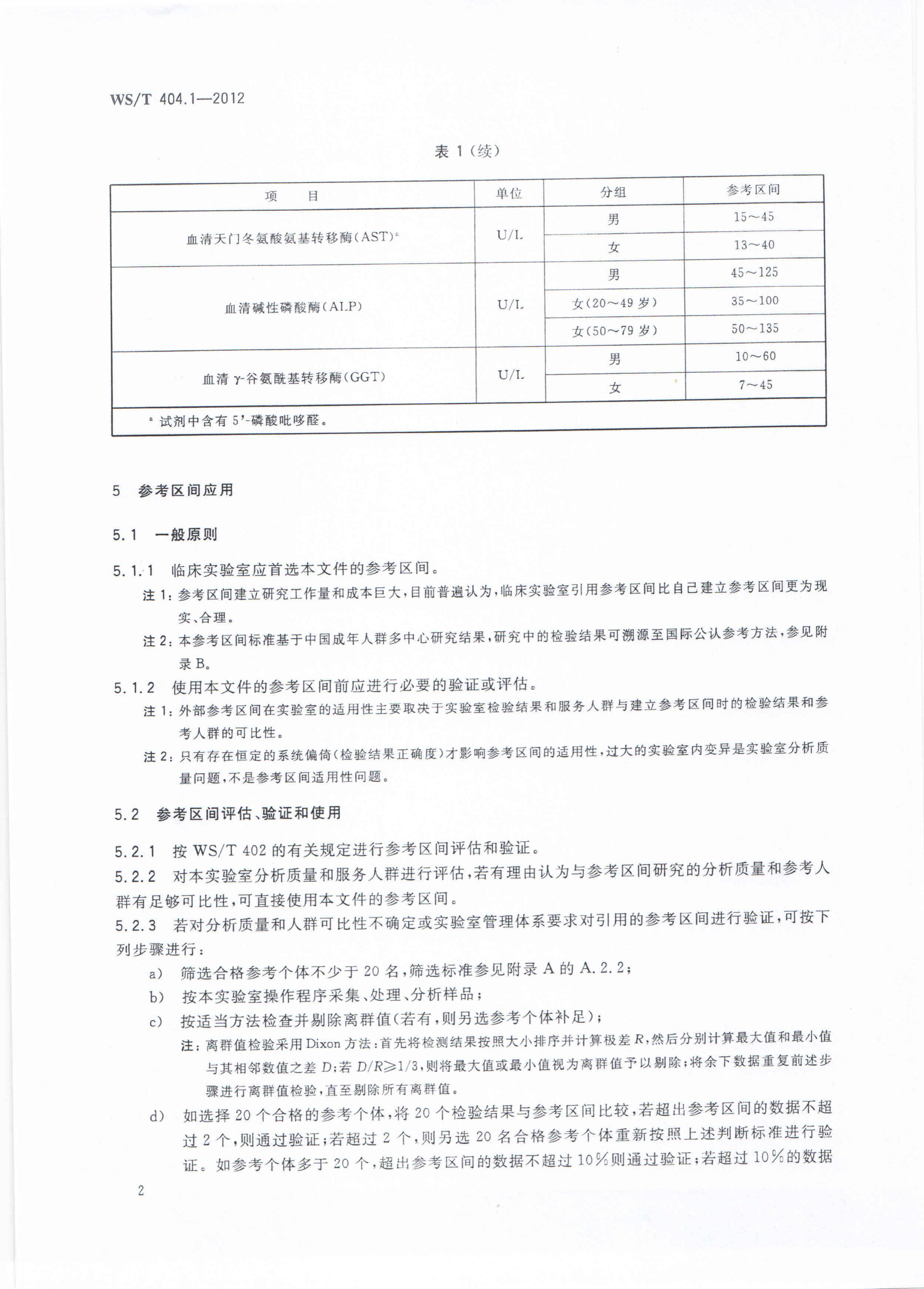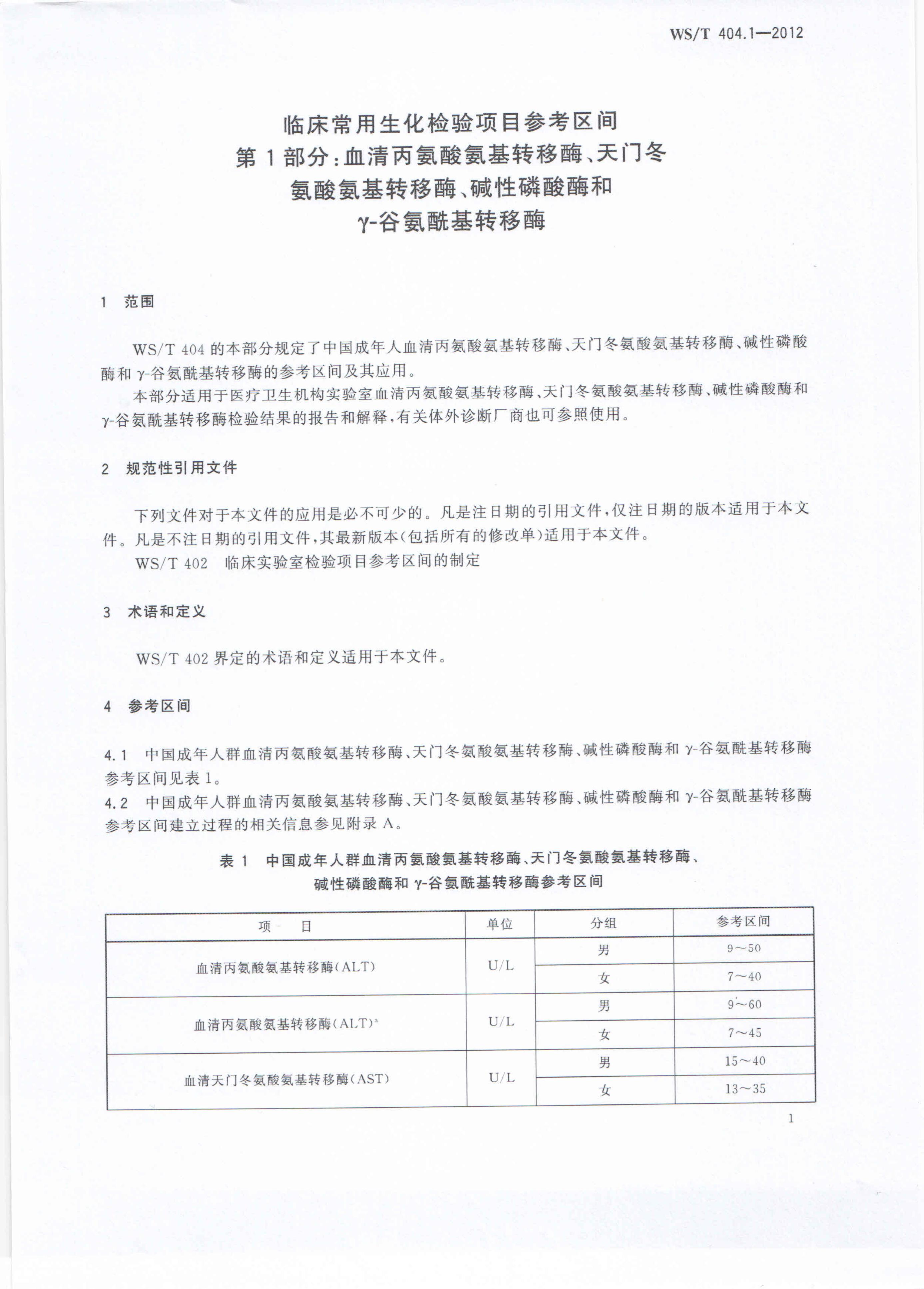 WS/T 404.1-2012 临床常用生化检验项目参考区间 第1部分:血清丙氨酸氨基转移酶、天门冬氨酸氨基转移酶、碱性磷酸酶和γ-谷氨酰基转移酶