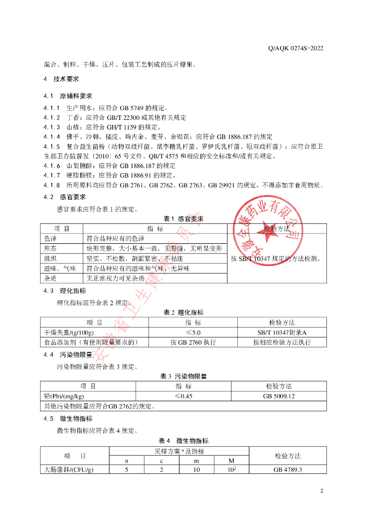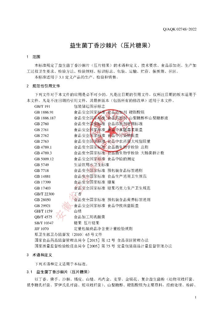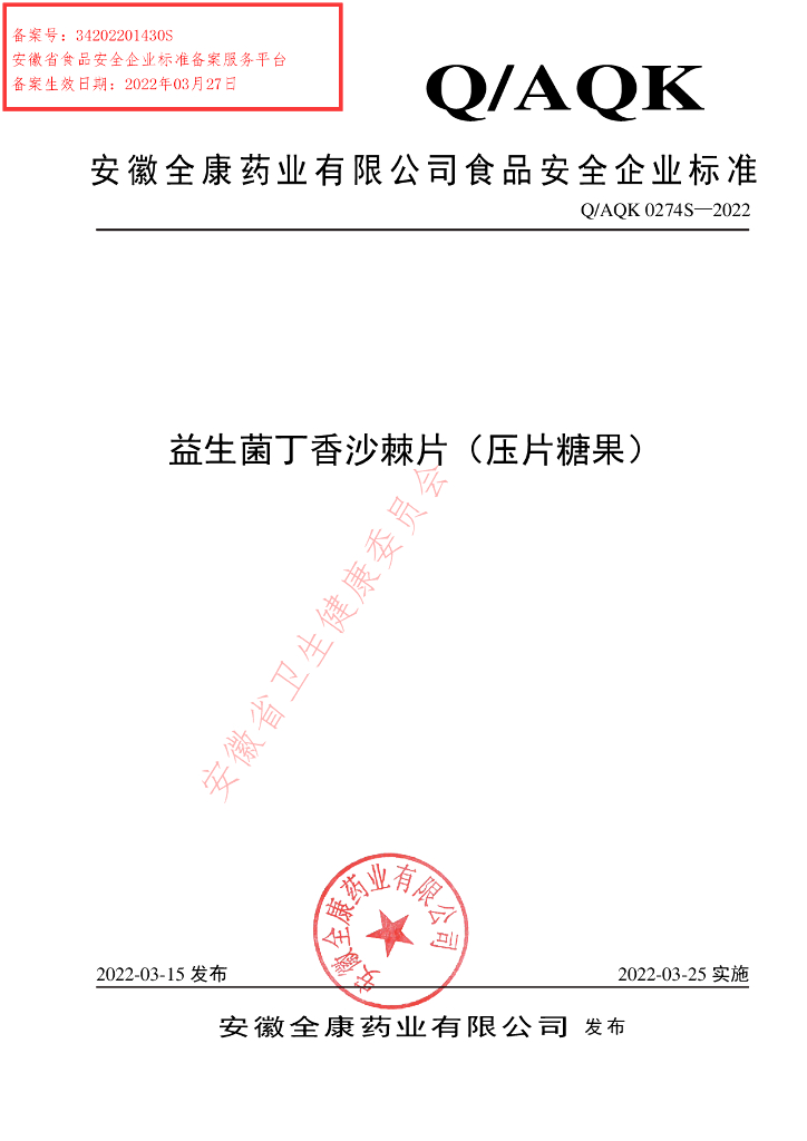 Q/AQK 0274S-2022 益生菌丁香沙棘片(压片糖果)