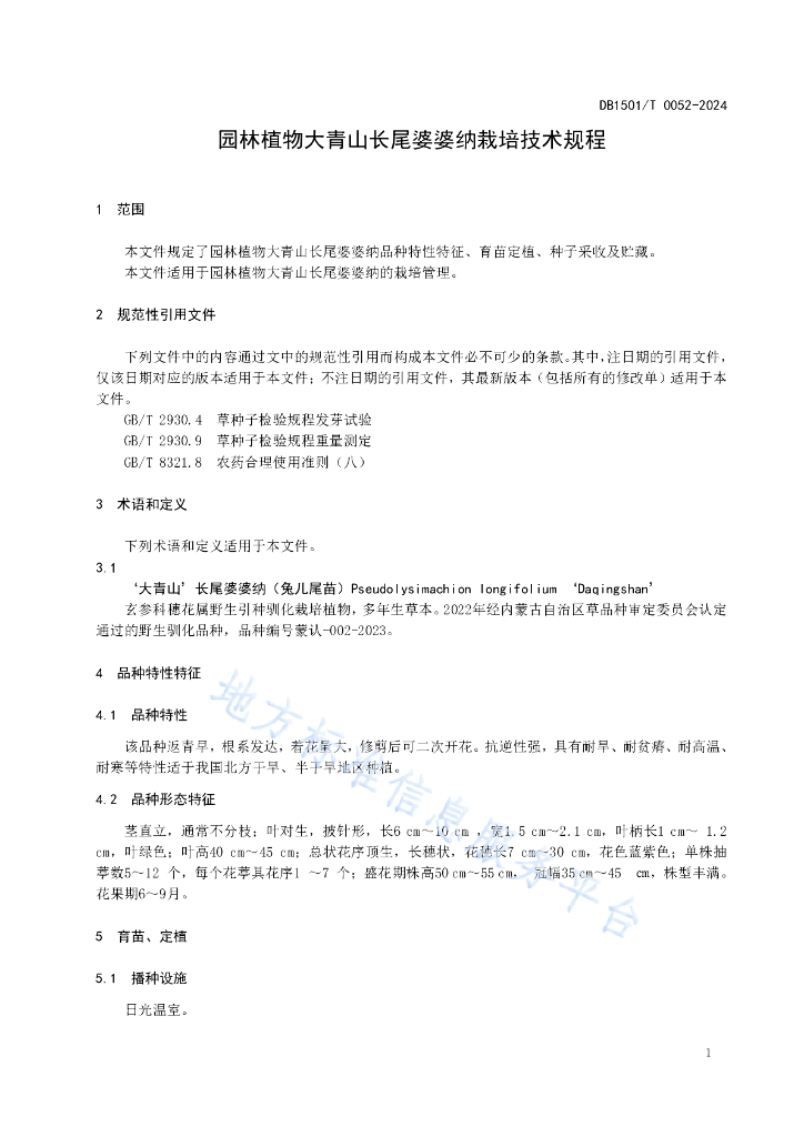 DB1501/T 0052-2024 园林植物大青山长尾婆婆纳栽培技术规程