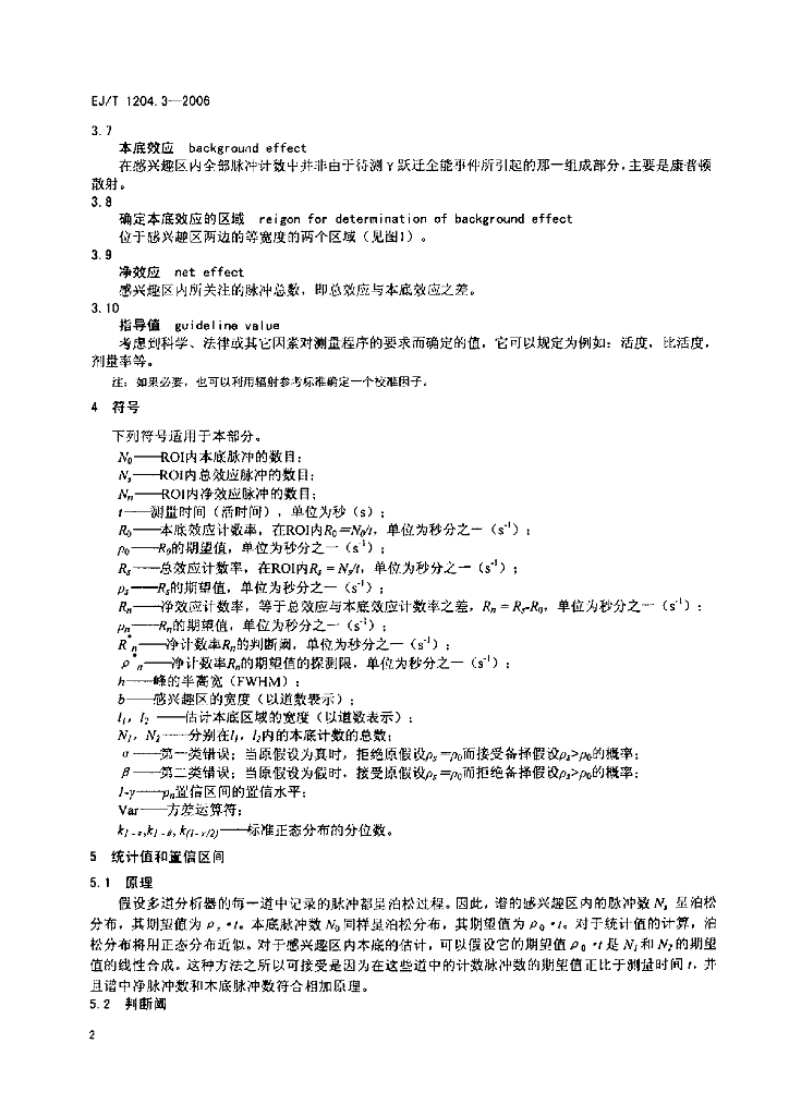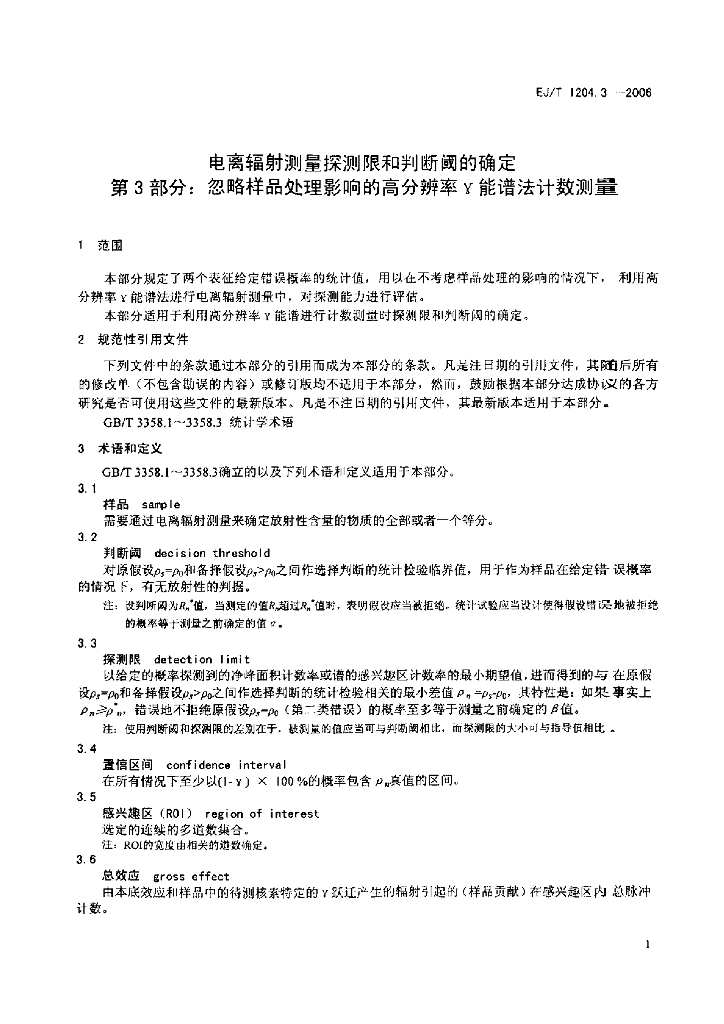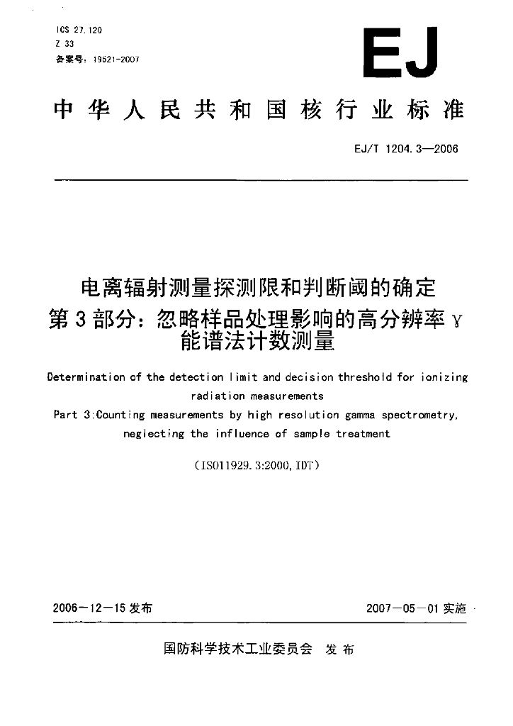 EJ/T 1204.3-2006 电离辐射测量探测限和判断阈的确定 第3部分:忽略样品处理影响的高分辨率γ能谱法计数测量