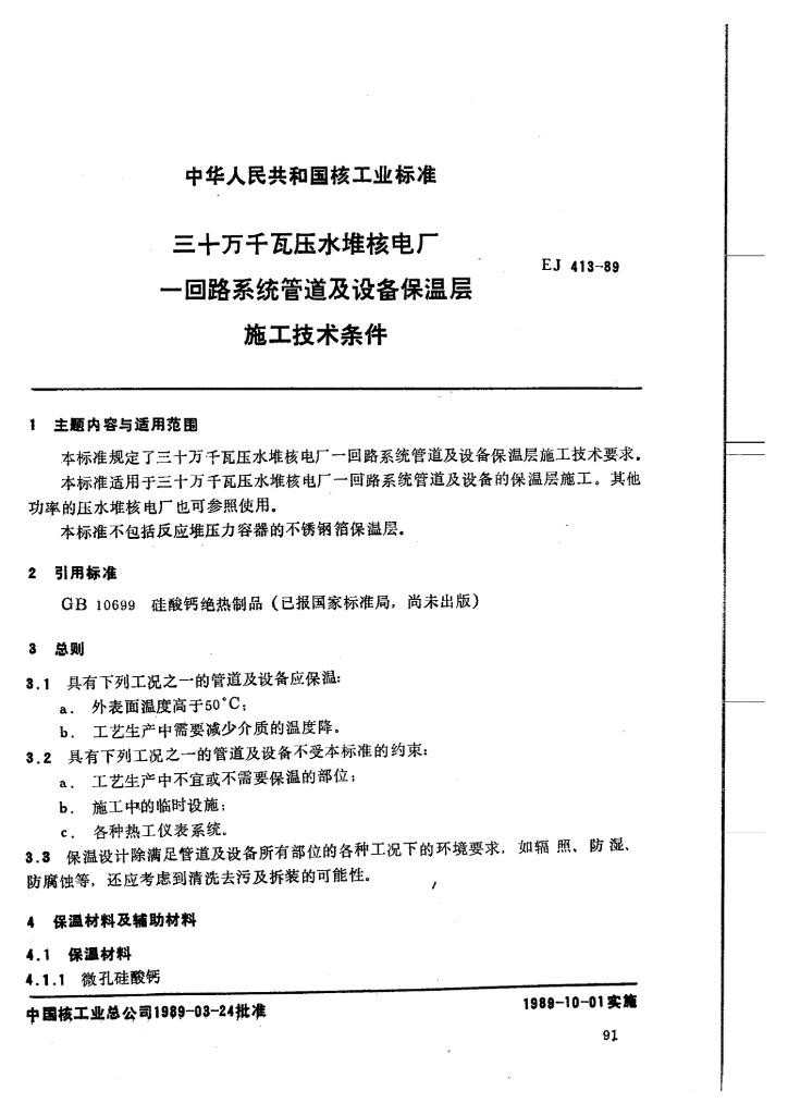EJ/T 413-1989 三十万千瓦压水堆核电厂 一回路系统管道及设备保温层施工技术条件