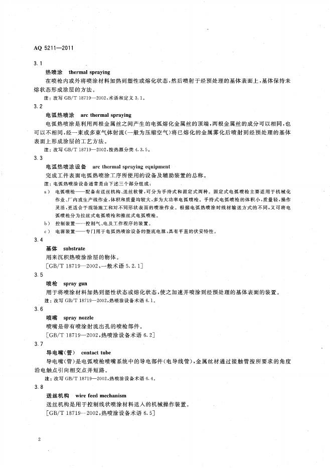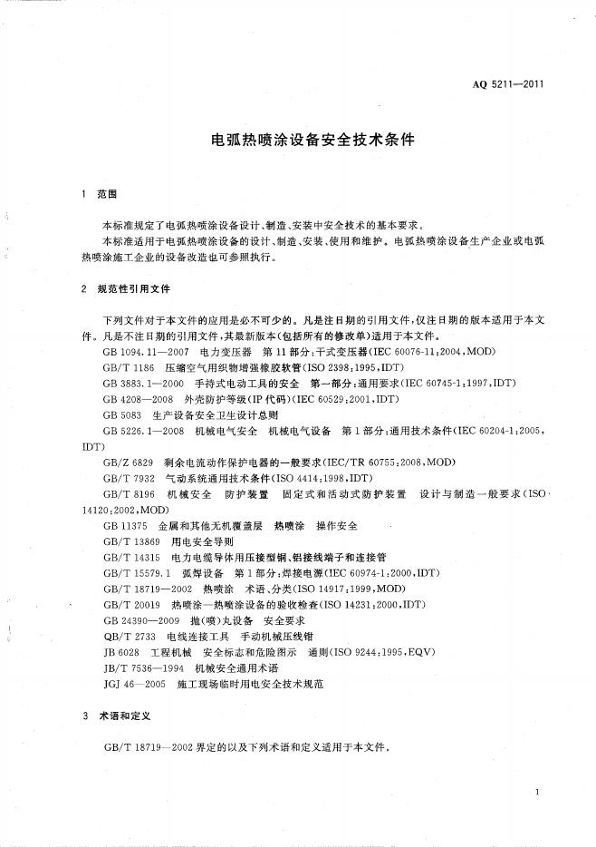AQ 5211-2011 电弧热喷涂设备安全技术条件