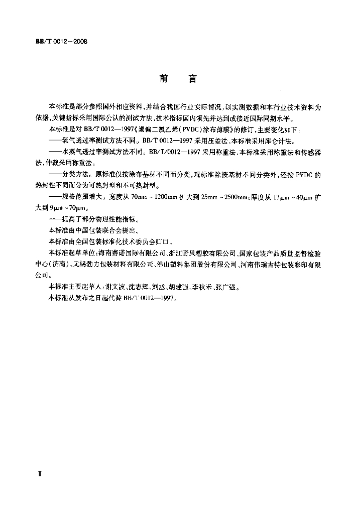 BB/T 0012-2008 聚偏二氯乙烯(PVDC)涂布薄膜