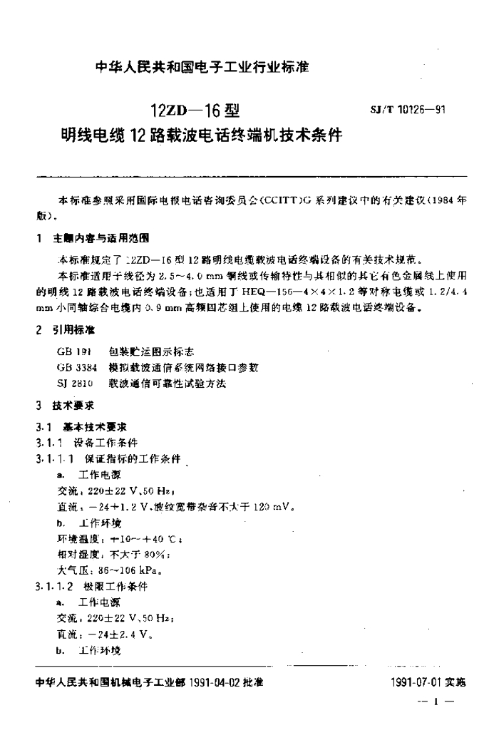 SJ/T 10126-1991 12ZD-16型明线电缆12路载波电话终端机 技术条件