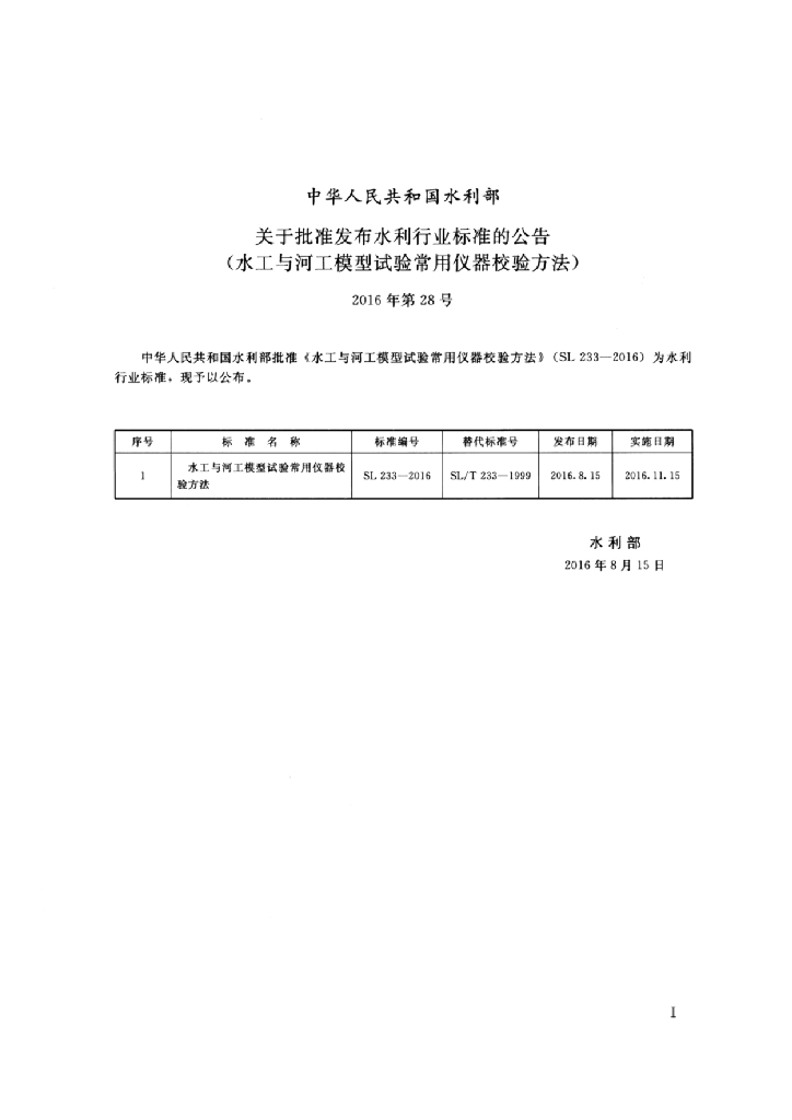 SL/T 233-2016 水工与河工模型试验常用仪器校验方法