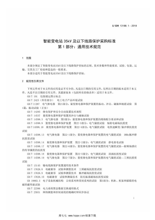 Q/GDW 13188.1-2018 智能变电站35kV及以下线路保护采购标准 第1部分:通用技术规范