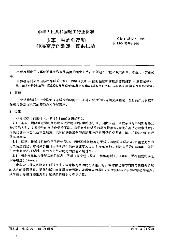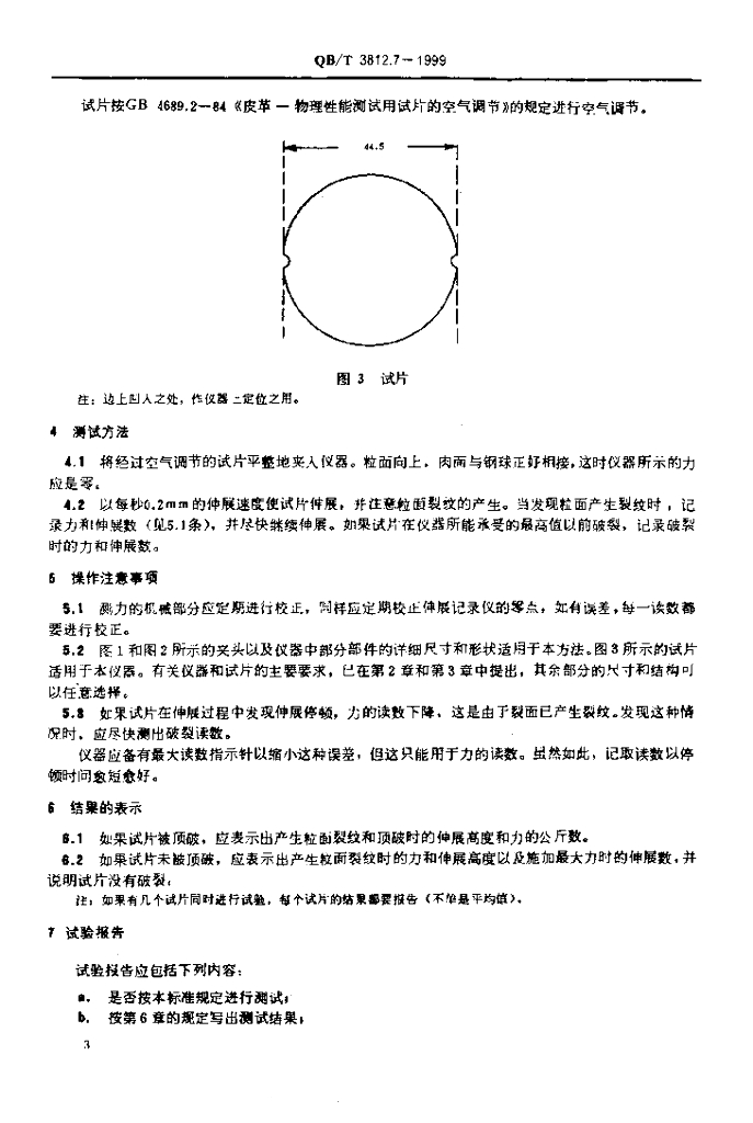 QB/T 3812.7-1999 皮革粒面强度和伸展高度的测定崩裂试验