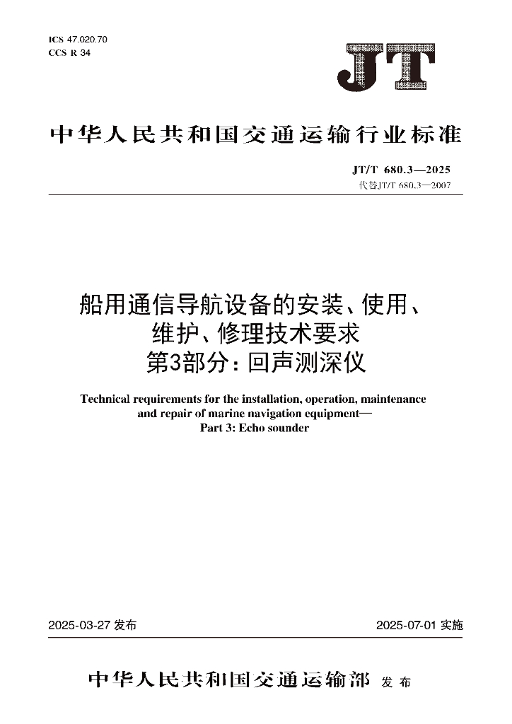 JT/T 680.3-2025 船用通信导航设备的安装、使用、维护、修理技术要求 第3部分:回声测深仪