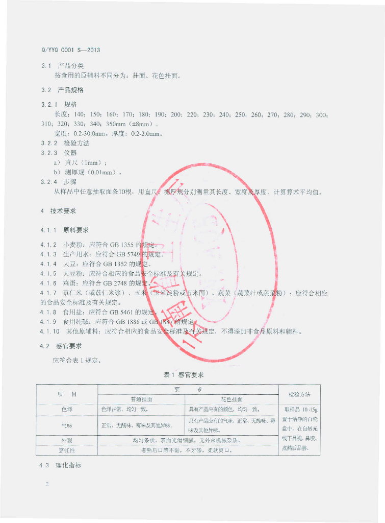 Q/YYQ 0001S-2013 挂面